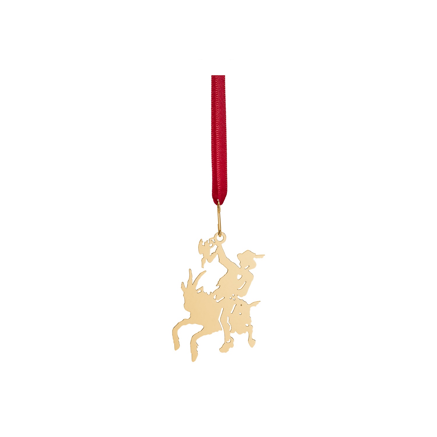 Bring Danish charm to your home for the holidays with the Clumsy Hans Pendant. Made of 18-karat gold-plated brass with a polished shine and delicate cut-out sections, this ornament references the fairytale "Clumsy Hans" by Hans Christian Andersen. This pendant comes with a red ribbon that makes it ready to hang on your tree.