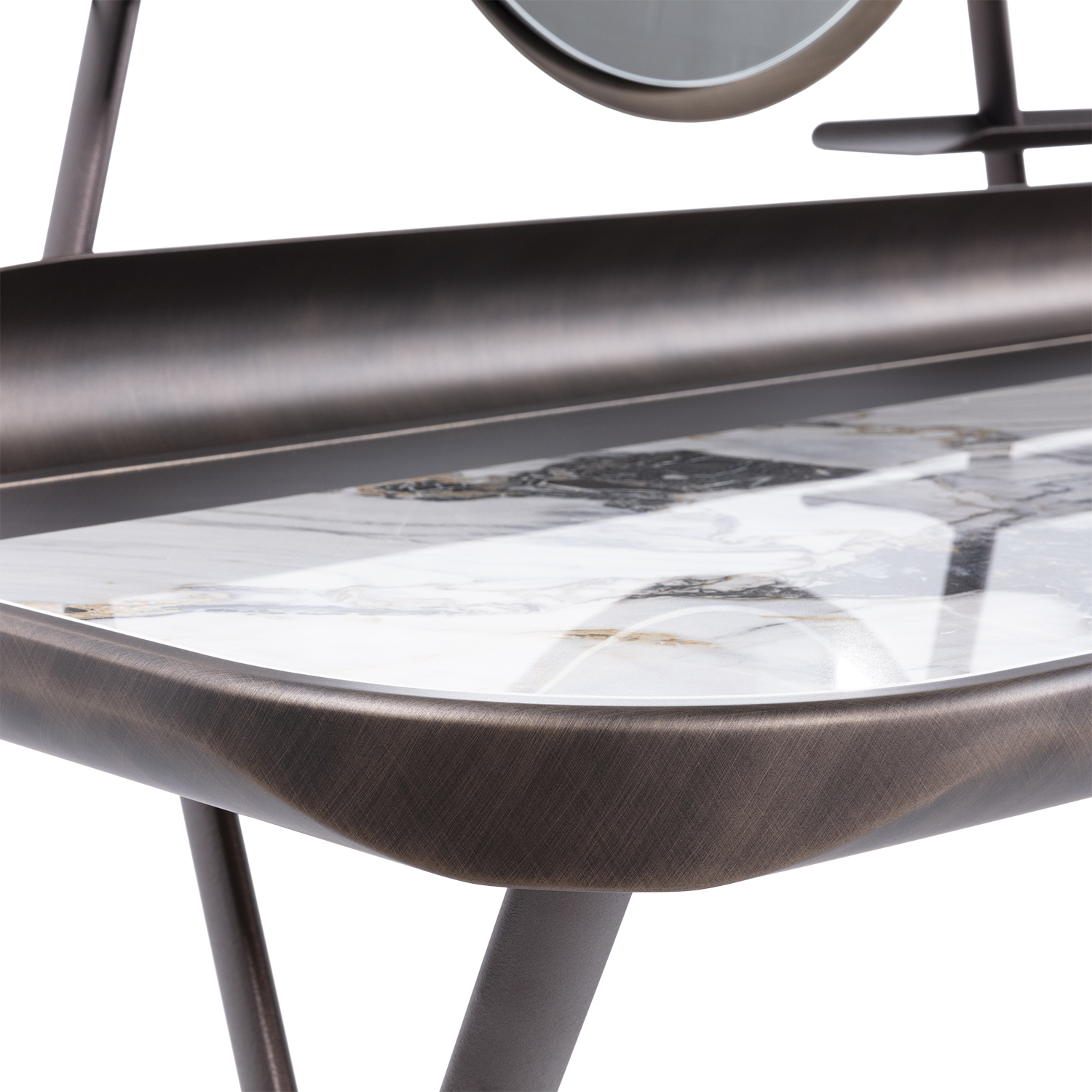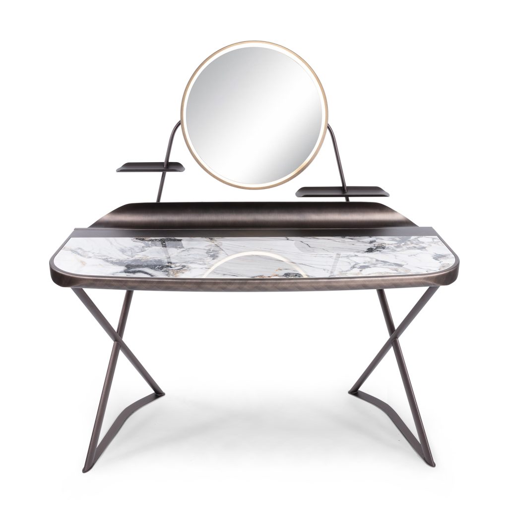 [0] => cocoon trousse dressing desk keramik with top in makalu km11 and brushed bronze, structure in bronze gfm18 and brushed bronze mirror frame. includes us spec led light. design paolo cattelan.