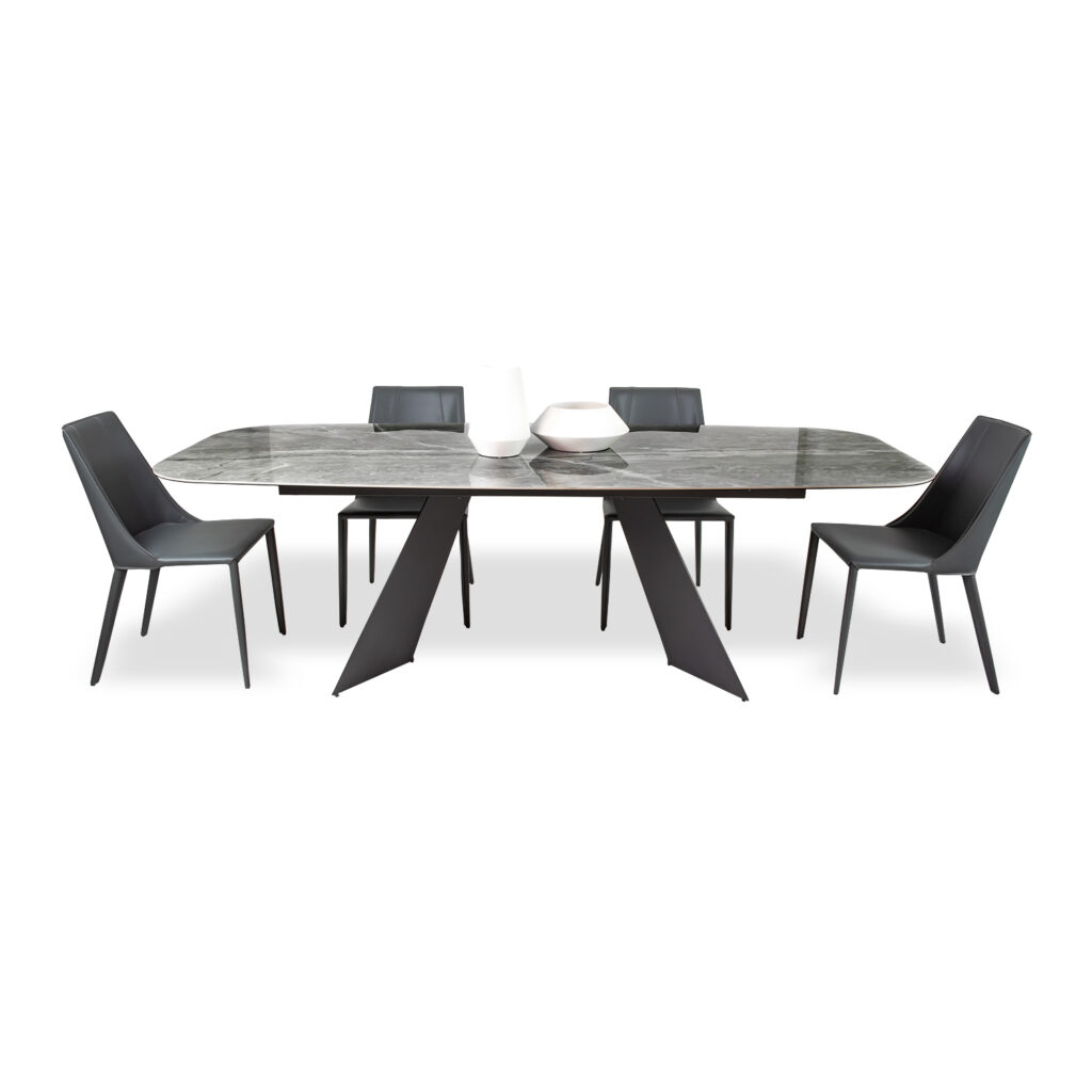 [0] => The Colbran Dining Table has a sculptural, contemporary silhouette, with angled legs in matte dark grey steel and a tabletop in grey laminated ceramic marble. The easy-care ceramic makes cleaning a breeze and means that Colbran is both stylish and functional. Rounded corners on Colbran's tabletop add a slight softness to the sleek, modern design, while the monochromatic color scheme allows this table to easily integrate into any contemporary dining environment.
