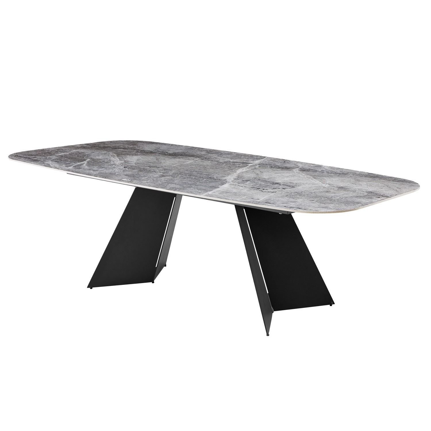 The Colbran Dining Table has a sculptural, contemporary silhouette, with angled legs in matte dark grey steel and a tabletop in grey laminated ceramic marble. The easy-care ceramic makes cleaning a breeze and means that Colbran is both stylish and functional. Rounded corners on Colbran's tabletop add a slight softness to the sleek, modern design, while the monochromatic color scheme allows this table to easily integrate into any contemporary dining environment.
