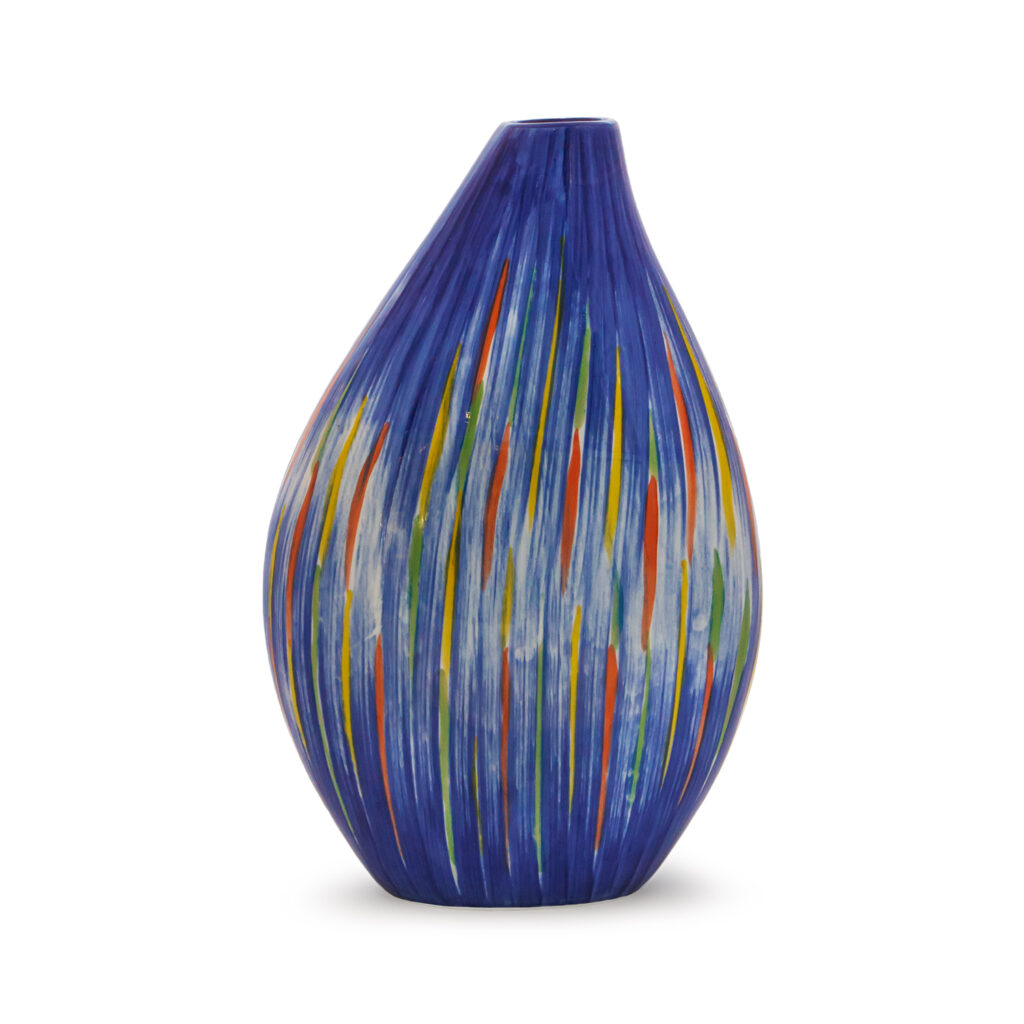 Inspired by the deep blues of the ocean and the vivid colors of a beach umbrella, the Color Blend Ceramic Bottle Vase features streaks of orange, yellow, and green set against a blue background. The asymmetrical silhouette of the vase mirrors the curved lines of color for a complementary look. This vase can be displayed on its own as an art piece or hold flowers and other greenery.