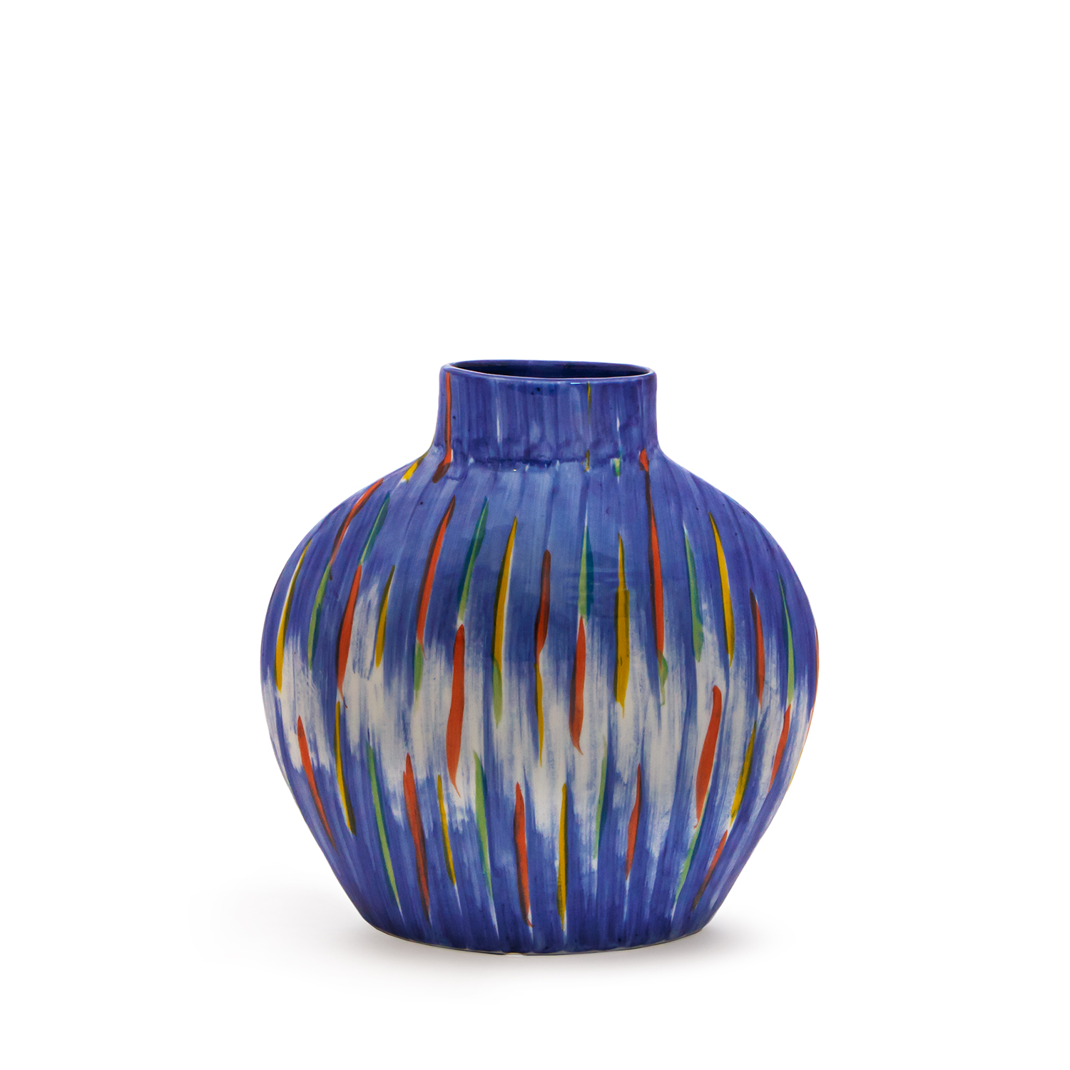 Inspired by the deep blues of the ocean and the vivid colors of a beach umbrella, the Color Blend Ceramic Vase features streaks of orange, yellow, and green set against a blue background. The asymmetrical silhouette of the vase mirrors the curved lines of color for a complementary look. This vase can be displayed on its own as an art piece or hold flowers and other greenery.