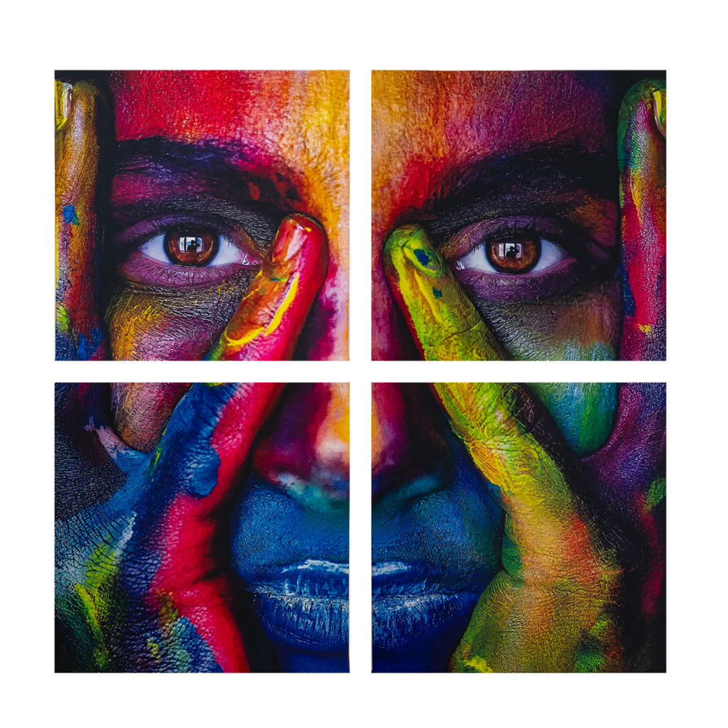 [0] => The Color Eyes Quadriptych Wall Art depicts a close-up portrait of a face painted in bright shades of yellow, green, purple, pink, blue, and more. The multitude of colors represented on the subject's skin makes this piece perfect for adding a vibrant contemporary accent, and their direct gaze and the reflection of the photographer in the subject's eyes brings the viewer in.