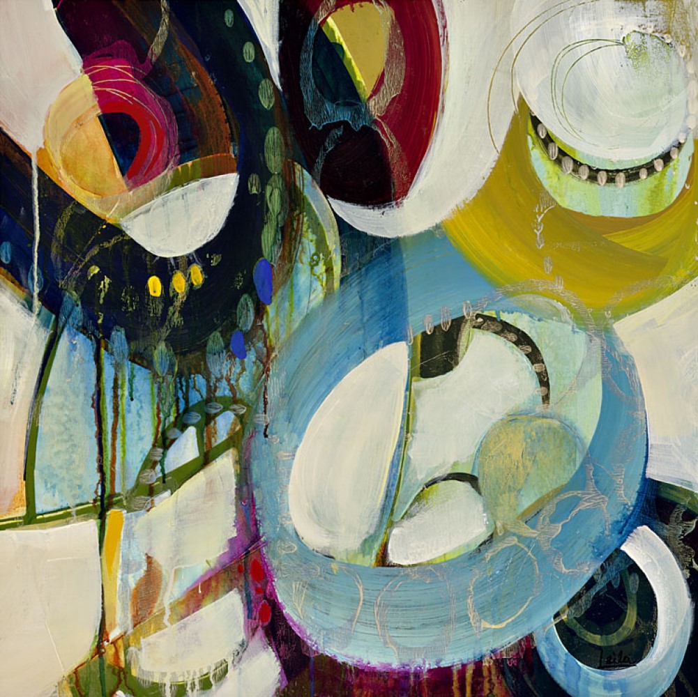 [0] => The Color Link II painting features curving, circular shapes of rich blue, purple, yellow, and green, that flow and move together in harmony. The white highlights allow the vividness of the colors to shine, bringing cheerful contemporary color to any living or office space.