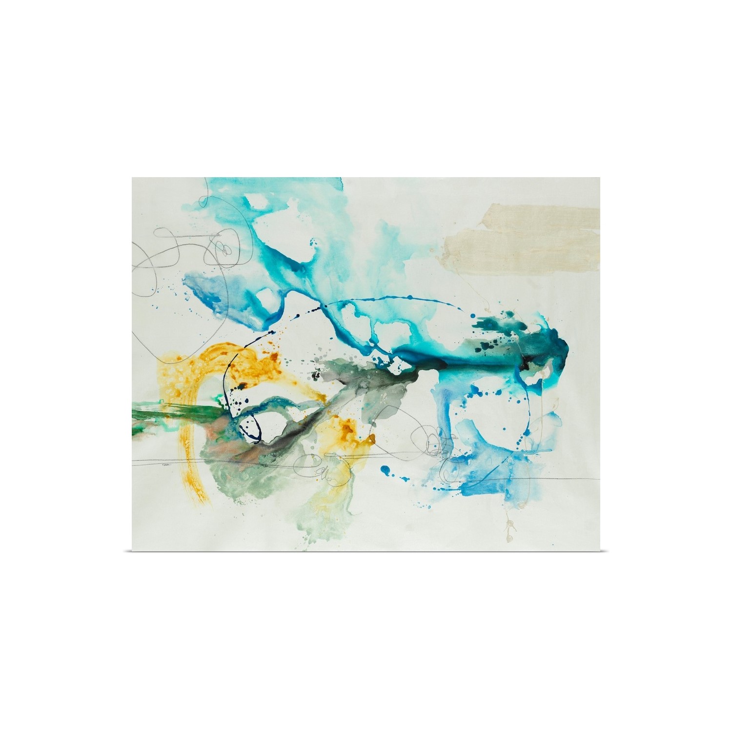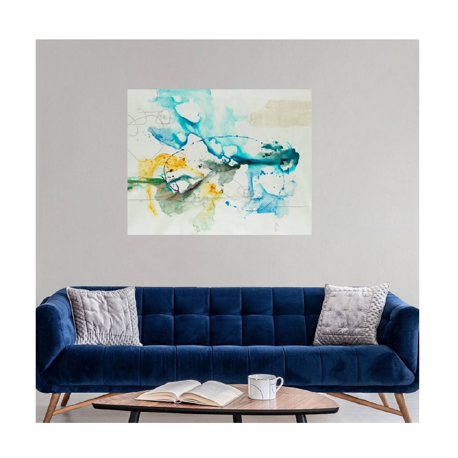 Colorful Dance is a free-flowing and impressionistic artwork by Rikki Drotar. A glossy surface coats bright splashes of blue, green, and yellow on an off-white background. This piece will add a touch of fluidity and lightness to any home or office.
