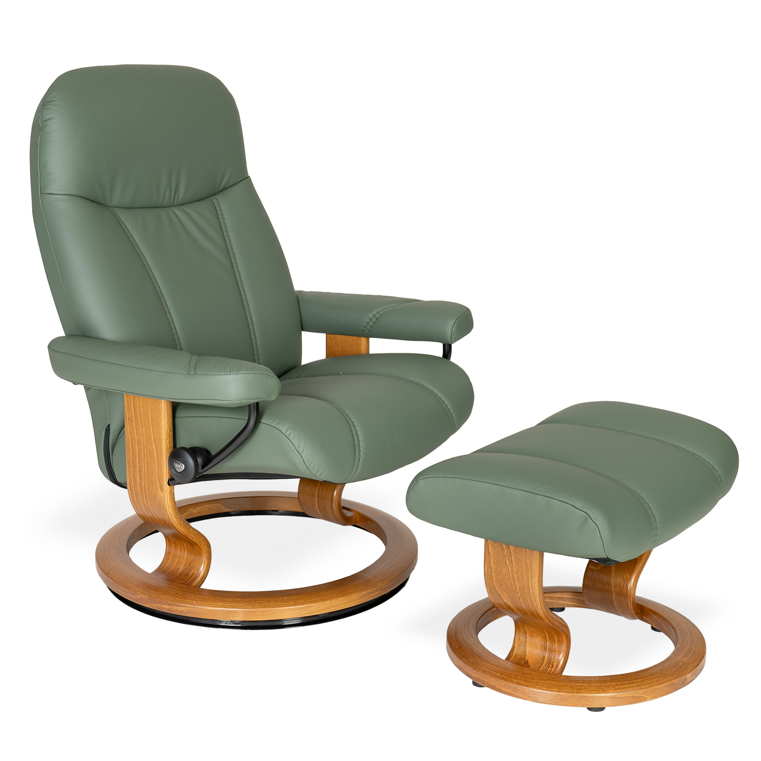 The Consul Large Chair and Ottoman, available in thyme green Batick leather with a teak classic base, is an enduring, high quality Stressless® design that has it all -- aesthetics, design value, and comfort-ensuring mechanisms. The Consul is equipped with Plus™ and Glide systems, which allow the chair to provide continuous support for the head and lower back, while also adjusting the reclining angle based on shifts of the body. Consul is a classic Stressless® recliner that fits easily into any home.