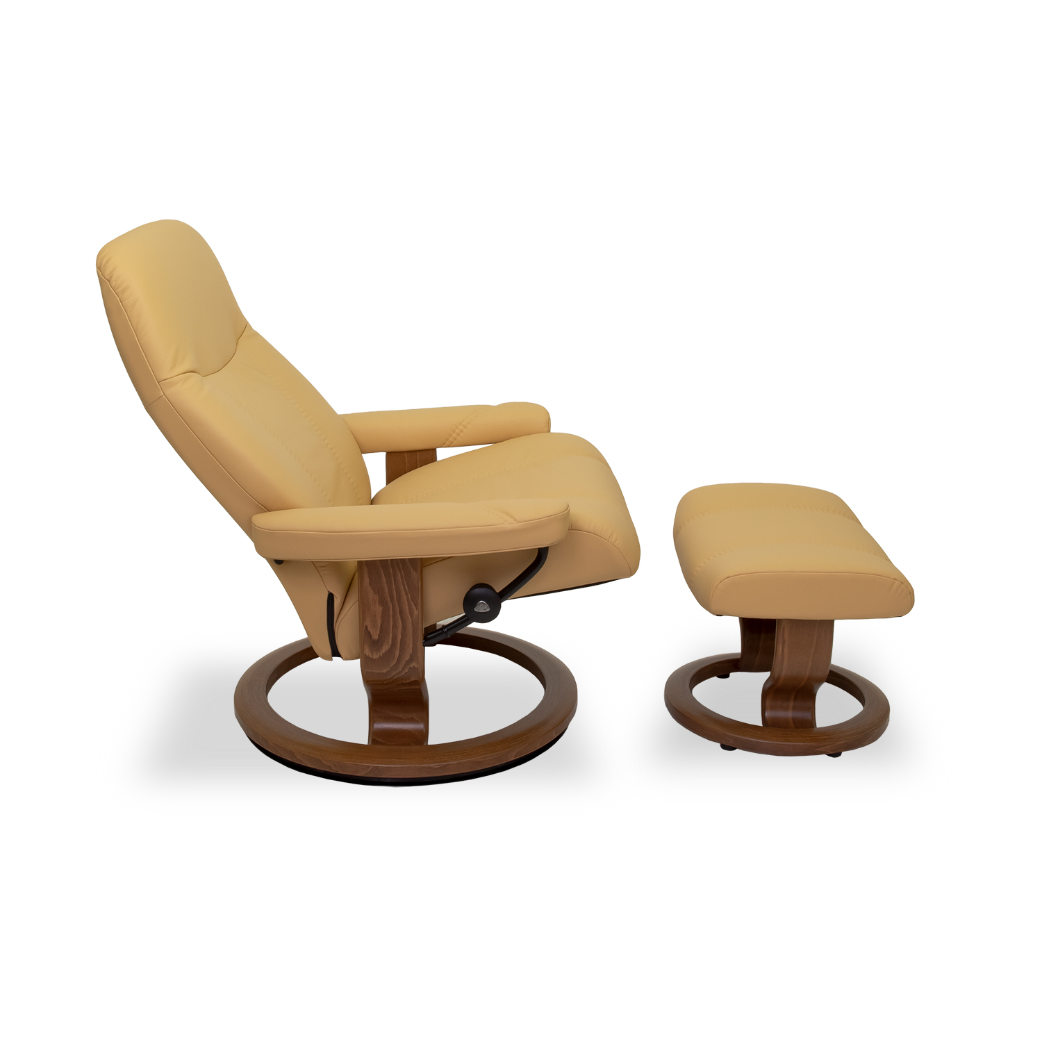 The Consul Medium Chair and Ottoman, available in yellow Batick leather with a teak classic base, is a classic, high quality Stressless® design that truly has it all — aesthetics, design value, and comfort-ensuring mechanisms. The Consul is equipped with Plus™ and Glide systems, which allow the chair to provide continuous support for the head and lower back, while also adjusting the reclining angle based on shifts of the body. Consul is a classic Stressless® recliner that fits easily into any home.
