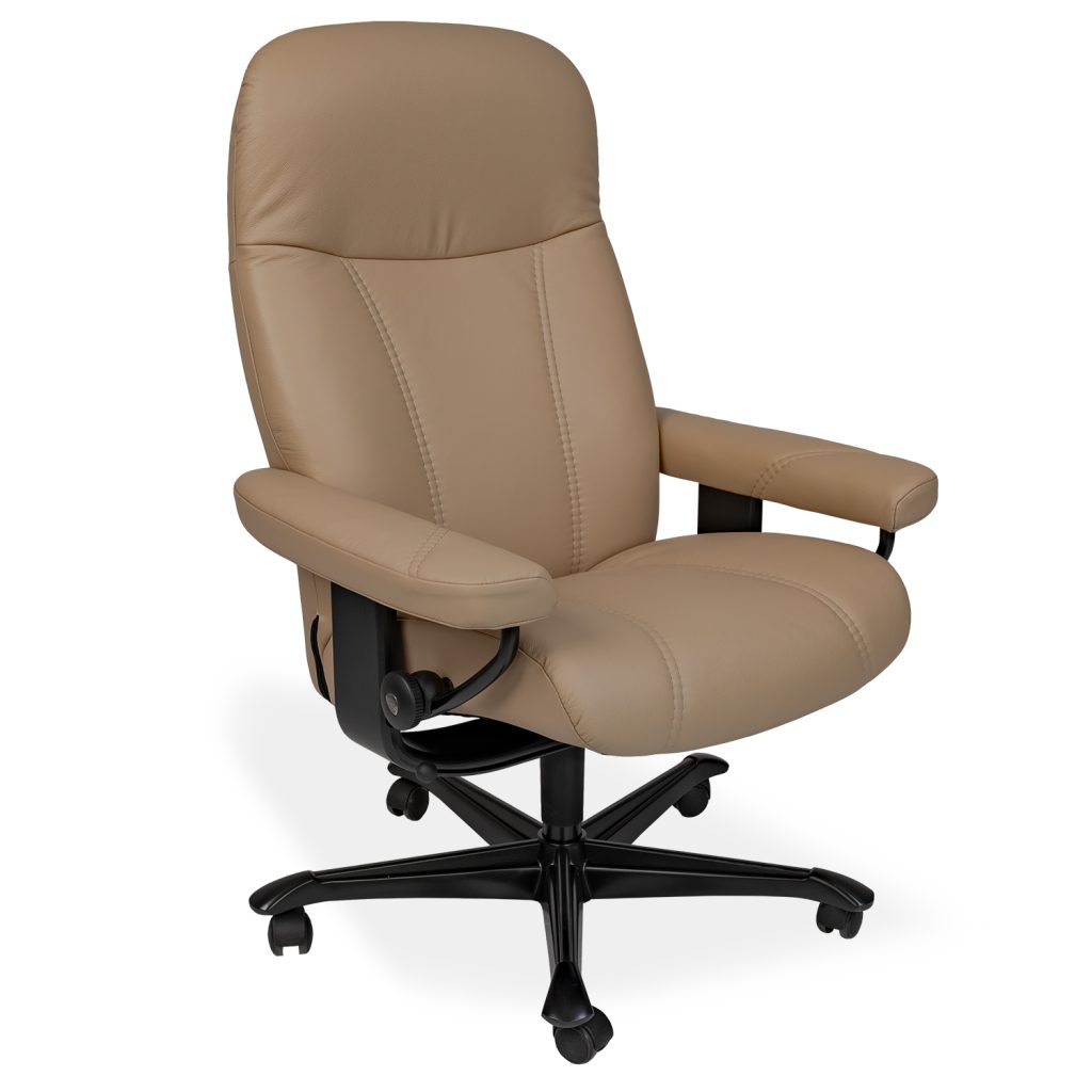 Bring classic Stressless® comfort and design to your office with the Consul Office Chair. Consul is equipped with Plus™ and Glide systems, which allow the chair to provide continuous support for the head and lower back, while also adjusting the reclining angle based on shifts of the body. A lever located under the seat allows you to adjust the seat height, and the wheeled base makes it easy to maneuver this chair around any space.