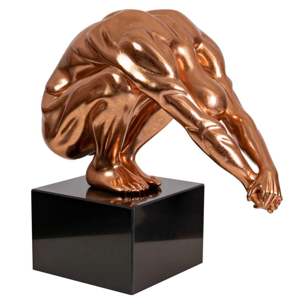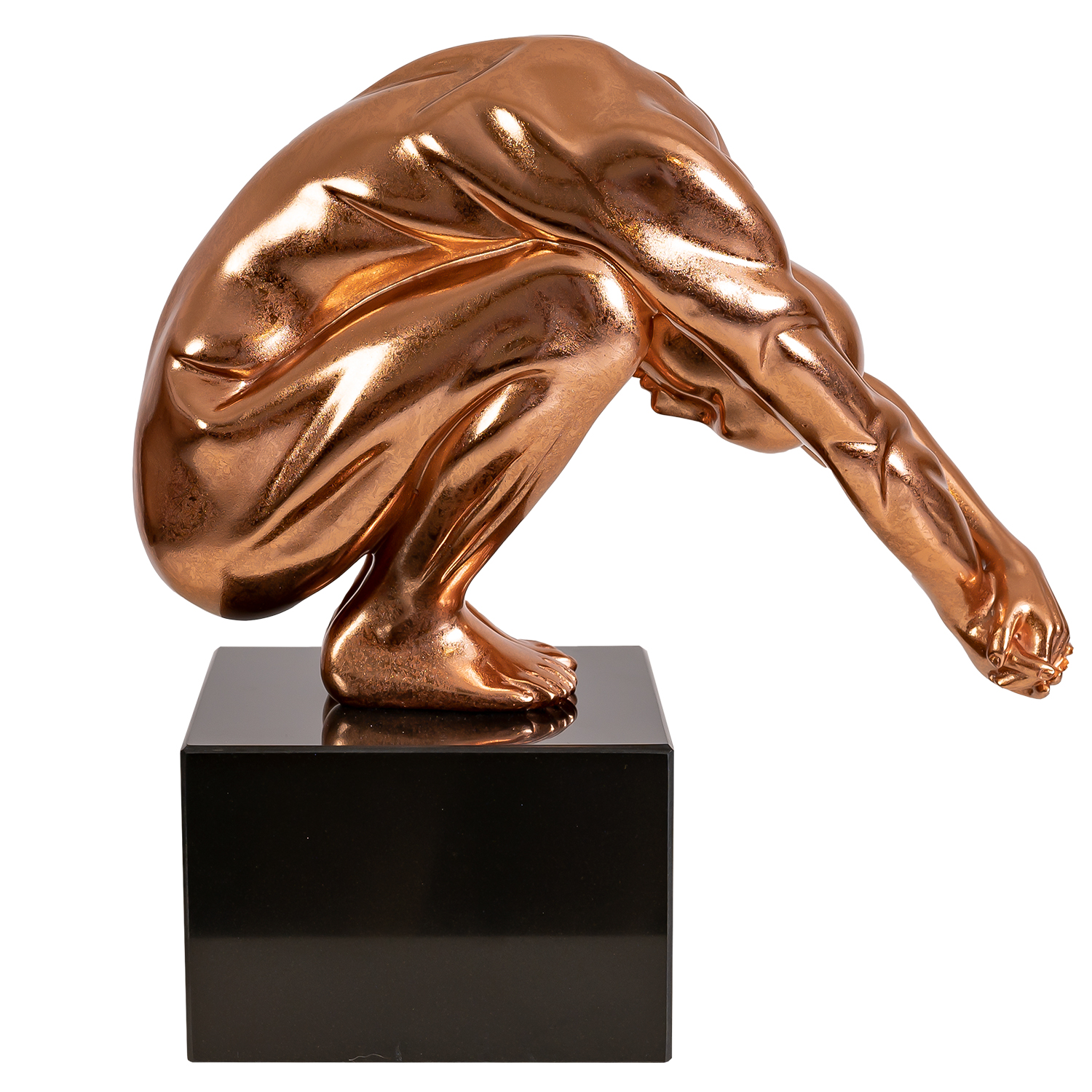 The Copper Diver Sculpture depicts a figure crouched forward with arms extended and hands clasped together, as though preparing to dive. Crafted from polyresin, this sculpture sports a metallic copper hue and a muscular form that evokes a sense of strength, grace, and potential energy. A cubic black base makes the Copper Diver ready to display.