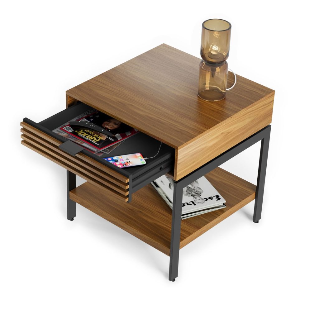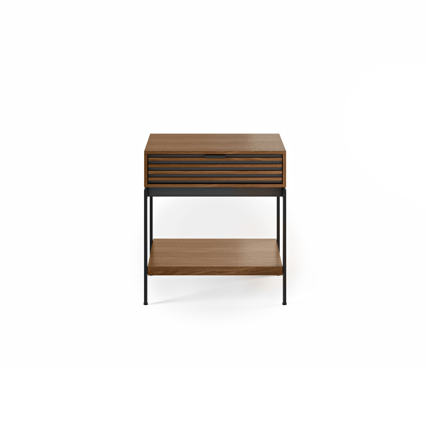 The Cora End Table, designed by Matthew Weatherly for BDI, features natural walnut wood, a louvered front, and black powder-coated steel legs. With its sleek form and open shelf, Cora offers a convenient place to set down anything from devices and remotes to drinks and magazines. The soft-close storage drawer has a low-profile pull and a soft interior lining that can be removed for cleaning if needed. Functional to the max, Cora also comes with integrated floor levelers and a power management compartment ideal for storing a power strip. Whether you place this table by your sofa, your bed, or your favorite chair, Cora's versatility will let it fit effortlessly into your home. Pair with matching Cora tables or items in BDI's Corridor collection for a seamless look.
