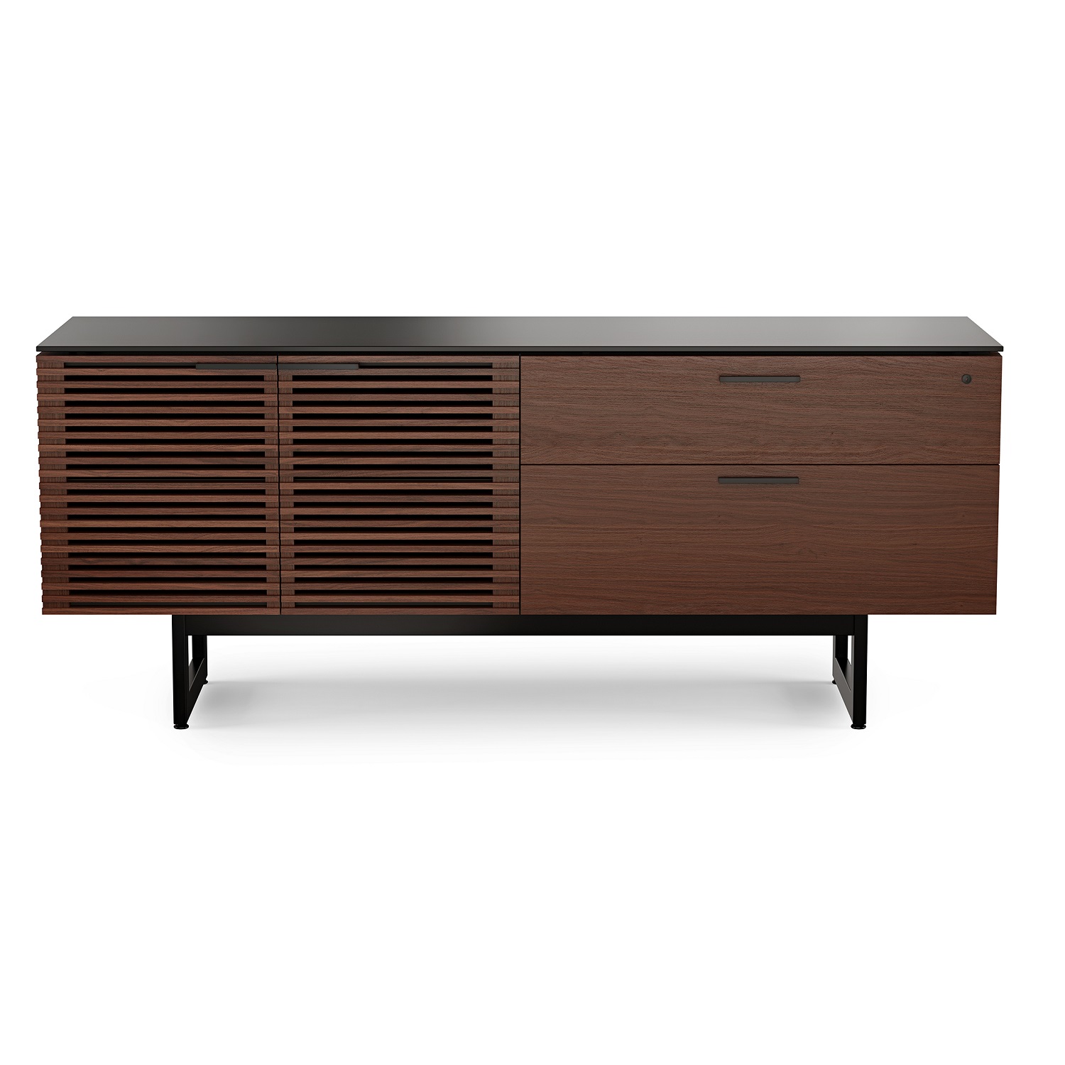 The Corridor Credenza was designed with the modern professional in mind. Featuring a soft yet durable satin-etched tempered glass top, chocolate walnut-stained wood, and powder-coated steel legs, Corridor's clean lines and refined styling is evident in every facet of its design. Louvered doors conceal a storage compartment with adjustable shelving, and two locking drawers provide space for letter- and legal-sized folders for easy organization.