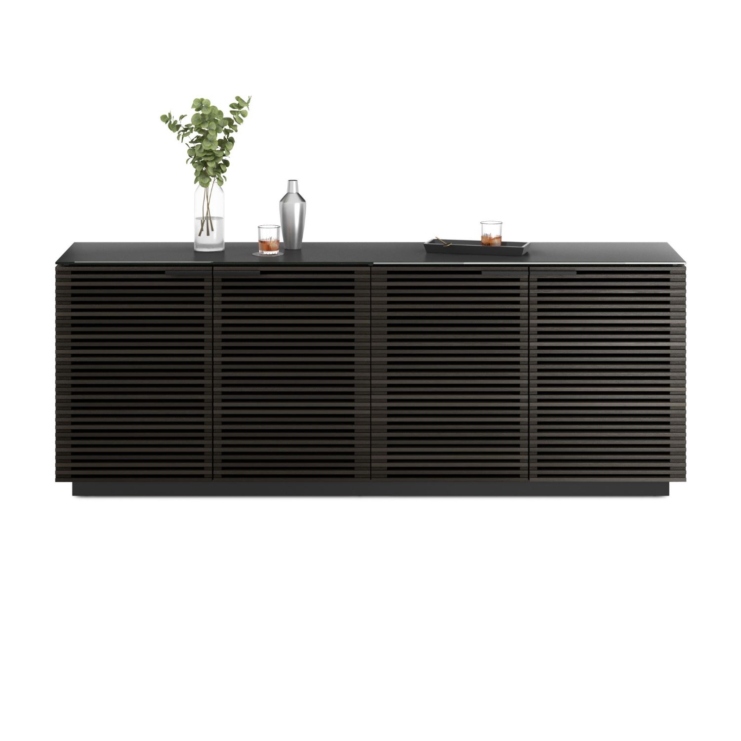 The Corridor Four Door Storage Cabinet by BDI is a large, contemporary credenza that forms part of the Corridor home collection. This versatile design can be used as a media console, dining buffet, or storage sideboard, with two adjustable glass shelves and two repositionable lined drawers allowing for ultimate customization. A durable, satin-etched tempered glass top complements the charcoal ash wood frame, which highlights the elegance of its mid-century modern design, and integrated wire management ensures your stored items remain secure and organized.