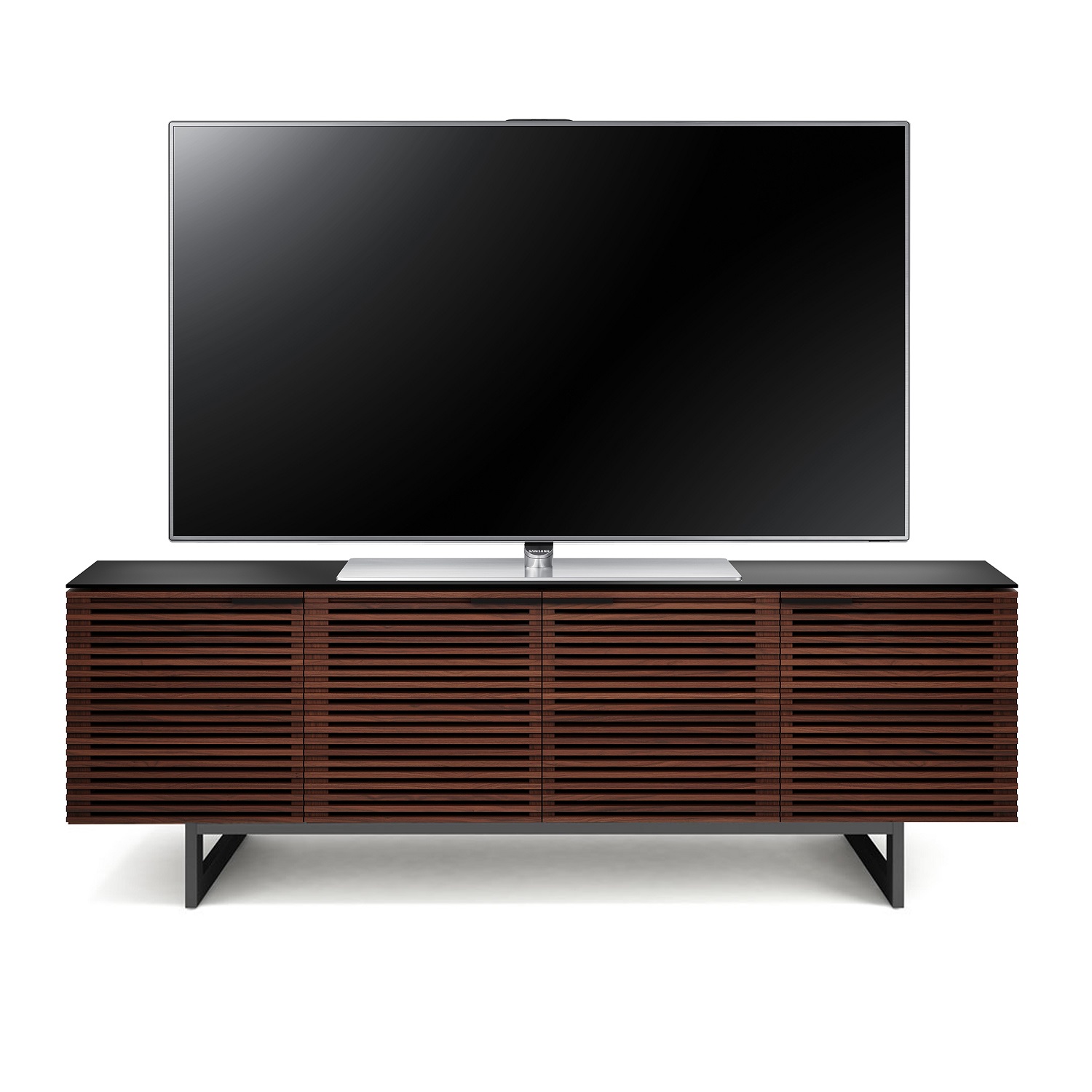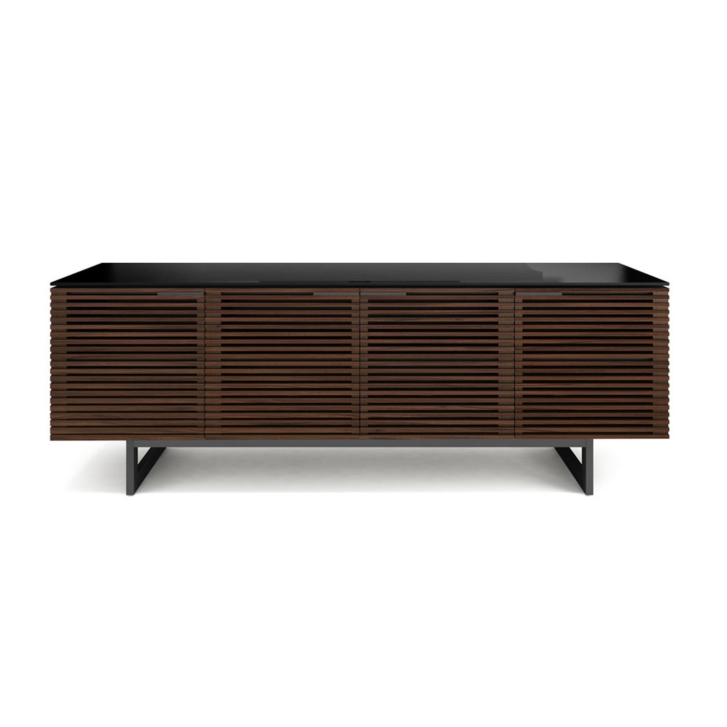 The Corridor TV Cabinet by BDI, available in chocolate-stained walnut, is a contemporary media unit that forms part of the Corridor home collection. Combining high functionality with premium design, the cabinet features remote-friendly and acoustically-transparent louvered doors, durable satin-etched tempered glass, a full-width soundbar shelf, built-in cable management, hidden wheels, and ample storage for movies, video games, and other media. Versatile and adaptable, the Corridor Four Door TV Cabinet will maximize storage space while adding style to any room.