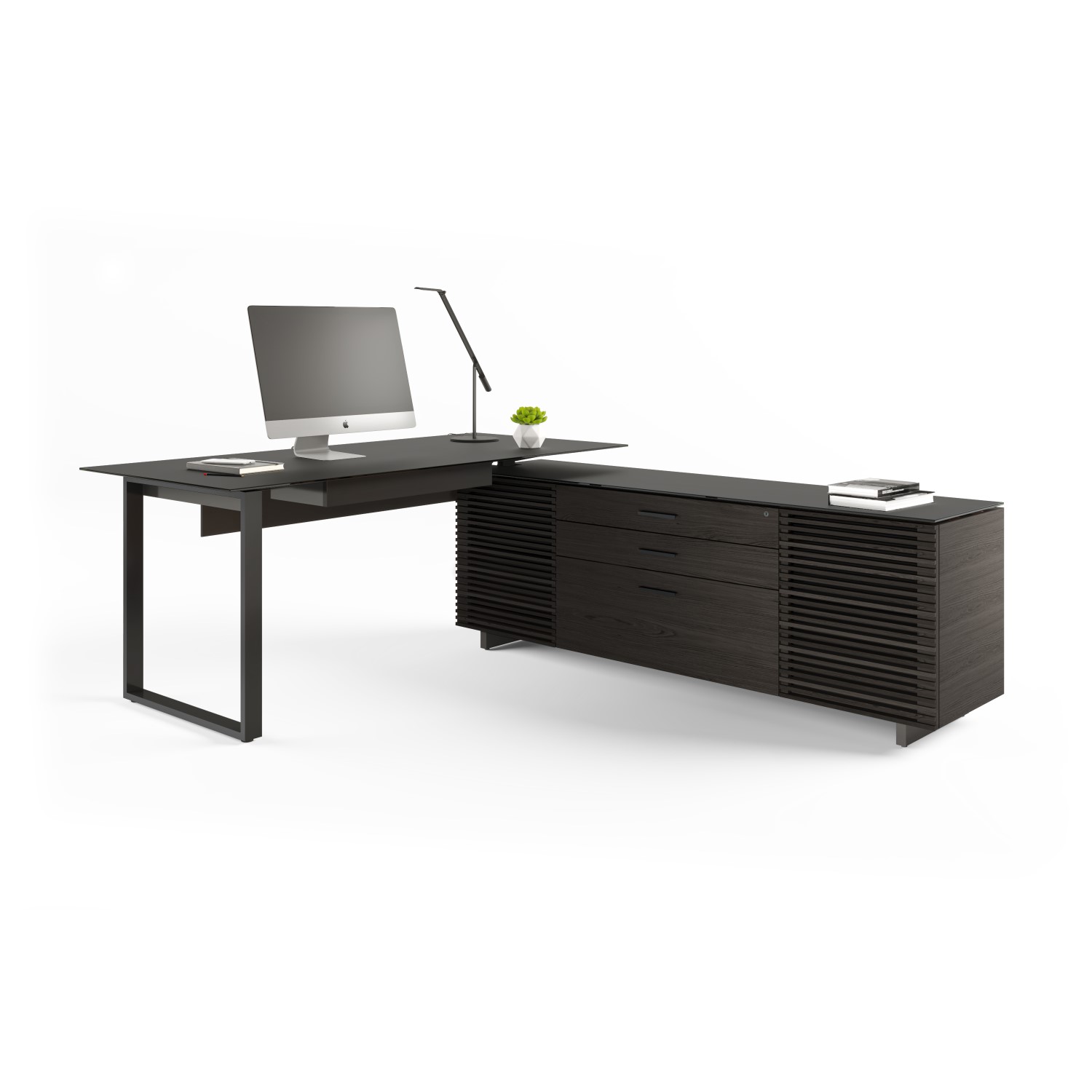The Corridor L-Desk was designed with the modern professional in mind. Featuring a soft yet durable satin-etched tempered glass top, a charcoal-stained ash wood finish, and powder-coated steel legs, Corridor's clean lines and refined styling is evident in every facet of its design. The desk features cable management channels and a nonslip, lined flip-down keyboard drawer with space to charge small devices. The storage unit has adjustable shelves, two locking storage drawers and a lateral file drawer that can accommodate letter and/or legal hanging files, a push-to-open printer tray, and ventilated louvered doors. The desk can be assembled on either the left or right side to suit your needs, and the modesty panel means the desk can be placed anywhere in a room and is optimized for comfortable cross-desk collaboration.