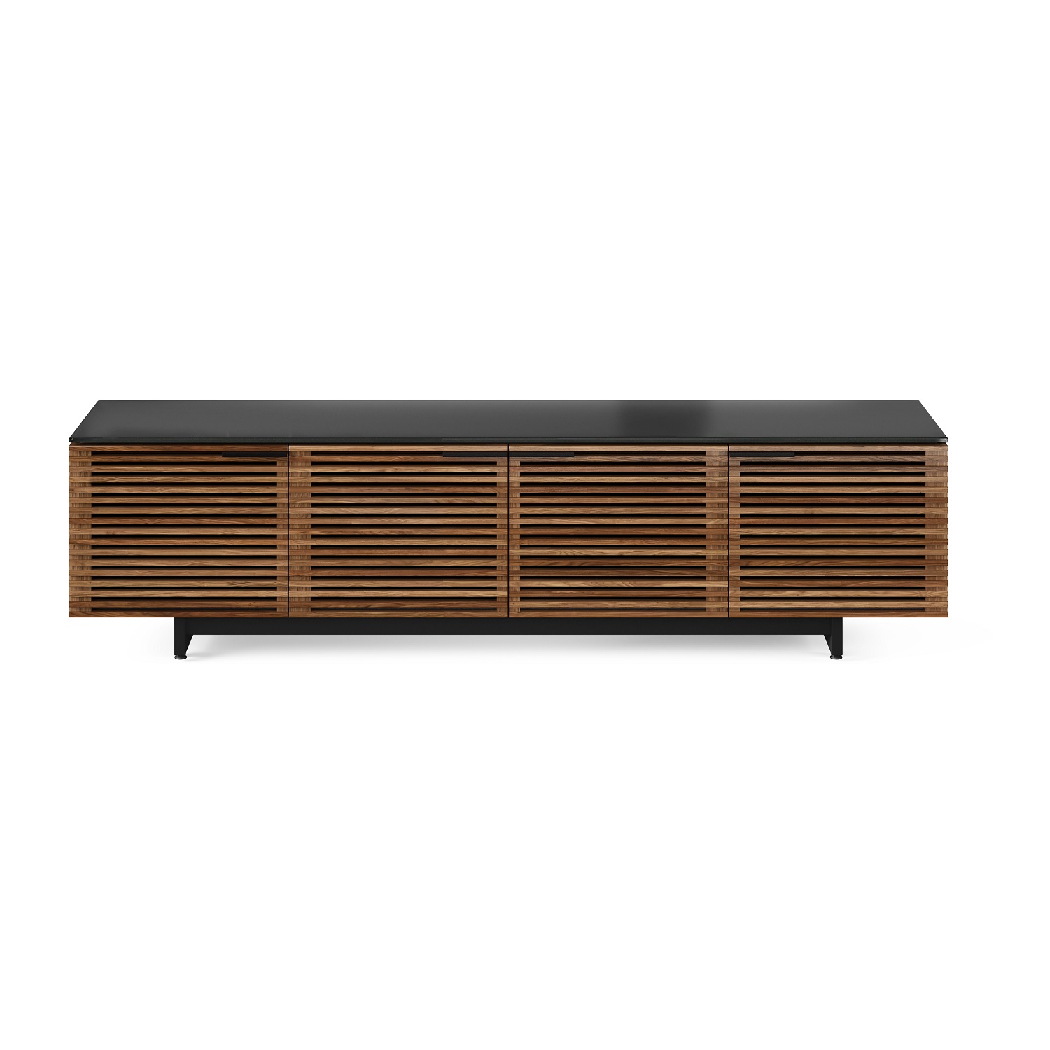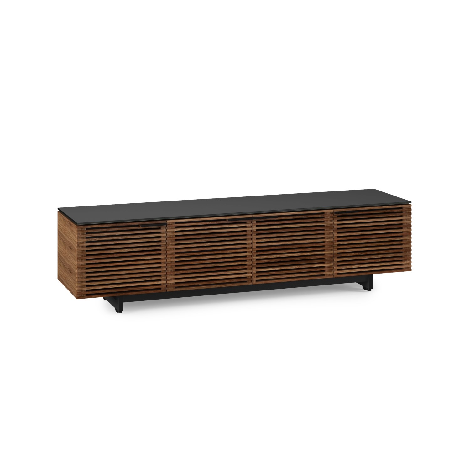 The Corridor Low TV Stand by BDI, available in natural walnut with a durable satin-etched tempered glass top, is a versatile media unit that forms part of the Corridor home collection. Featuring an integrated soundbar shelf, remote-friendly and acoustically-transparent louvered doors, built-in cable management, hidden wheels, and rear access panels, this TV stand has everything you need in an entertainment system. The Corridor Low TV Stand's low-profile design will maximize storage space while adding style to any room.