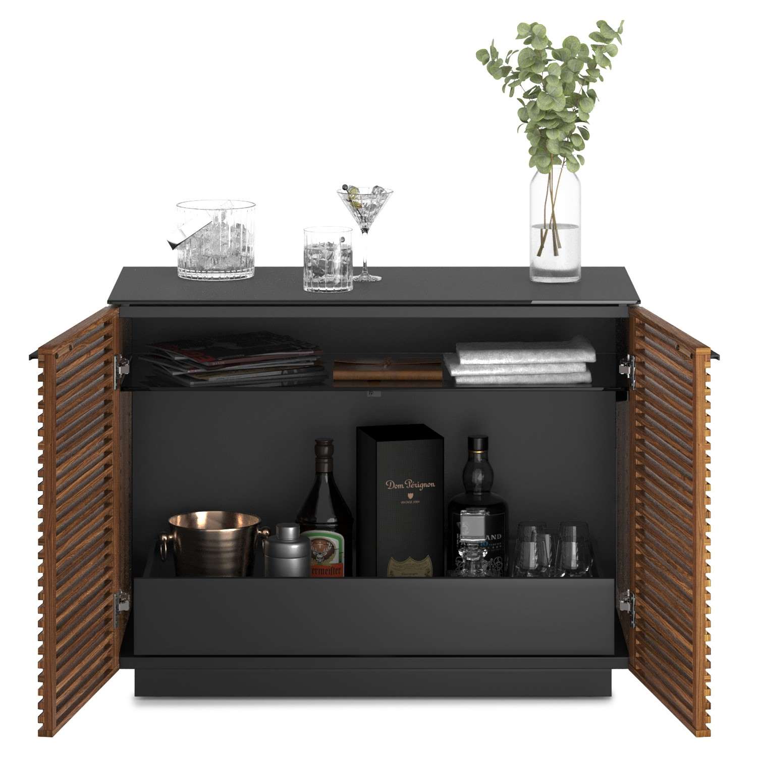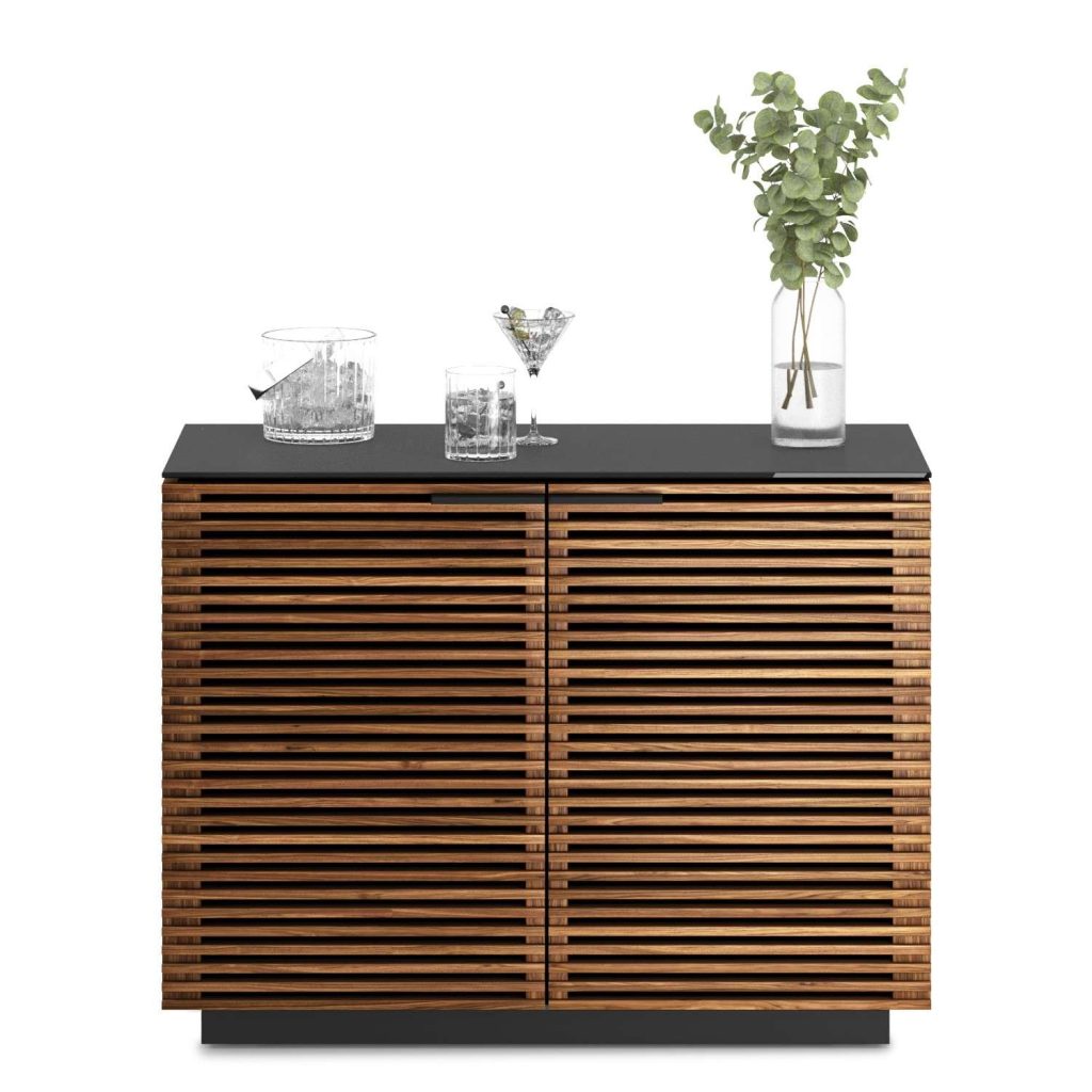 The Corridor Storage Unit by BDI is a slim, contemporary cabinet forms part of the Corridor home collection. This versatile design can be used as a media console, dining bar, or storage sideboard, with an adjustable glass shelf and repositionable lined drawer allowing for ultimate customization. A durable, satin-etched tempered glass top complements the natural walnut wood frame, which highlights the elegance of its mid-century modern design, and integrated wire management ensures your stored items remain secure and organized.
