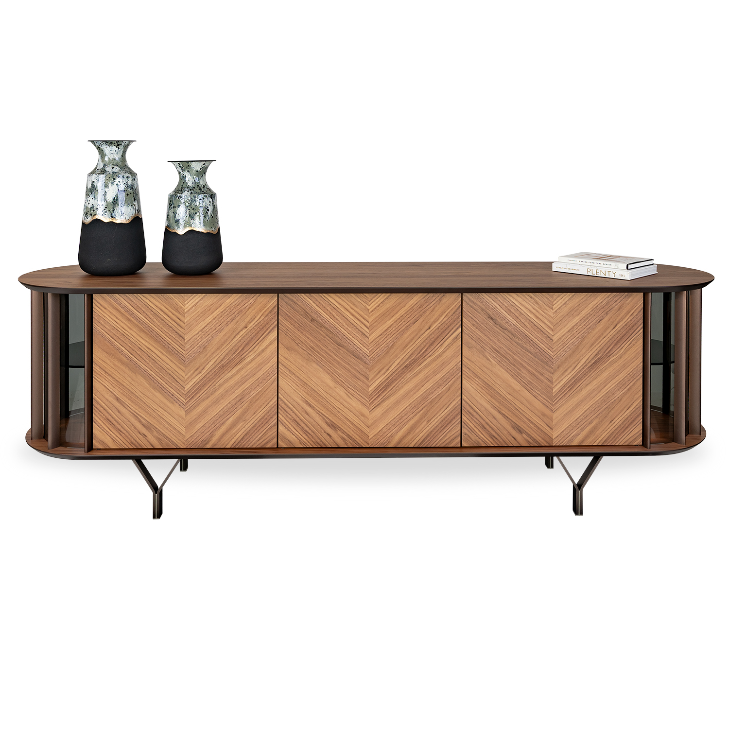Cattelan Italia's Costes Sideboard features a skillful blend of materials in an utterly unique design. Costes' top and front are made of natural walnut wood, with its three doors boasting an eye-catching diagonal grain pattern. Rounded fumé glass sides allow a view of the interior (with matching glass shelving) and are accented with embossed bronze inserts for an edgy look. A base with a matching bronze finish is supported by striking Y-shaped legs, while LED lighting adds the finishing touch to this one-of-a-kind sideboard.