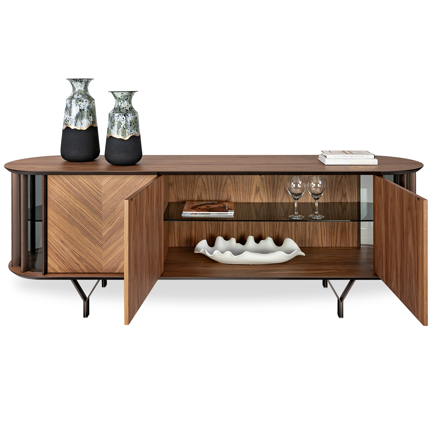 [0] => Cattelan Italia's Costes Sideboard features a skillful blend of materials in an utterly unique design. Costes' top and front are made of natural walnut wood, with its three doors boasting an eye-catching diagonal grain pattern. Rounded fumé glass sides allow a view of the interior (with matching glass shelving) and are accented with embossed bronze inserts for an edgy look. A base with a matching bronze finish is supported by striking Y-shaped legs, while LED lighting adds the finishing touch to this one-of-a-kind sideboard.