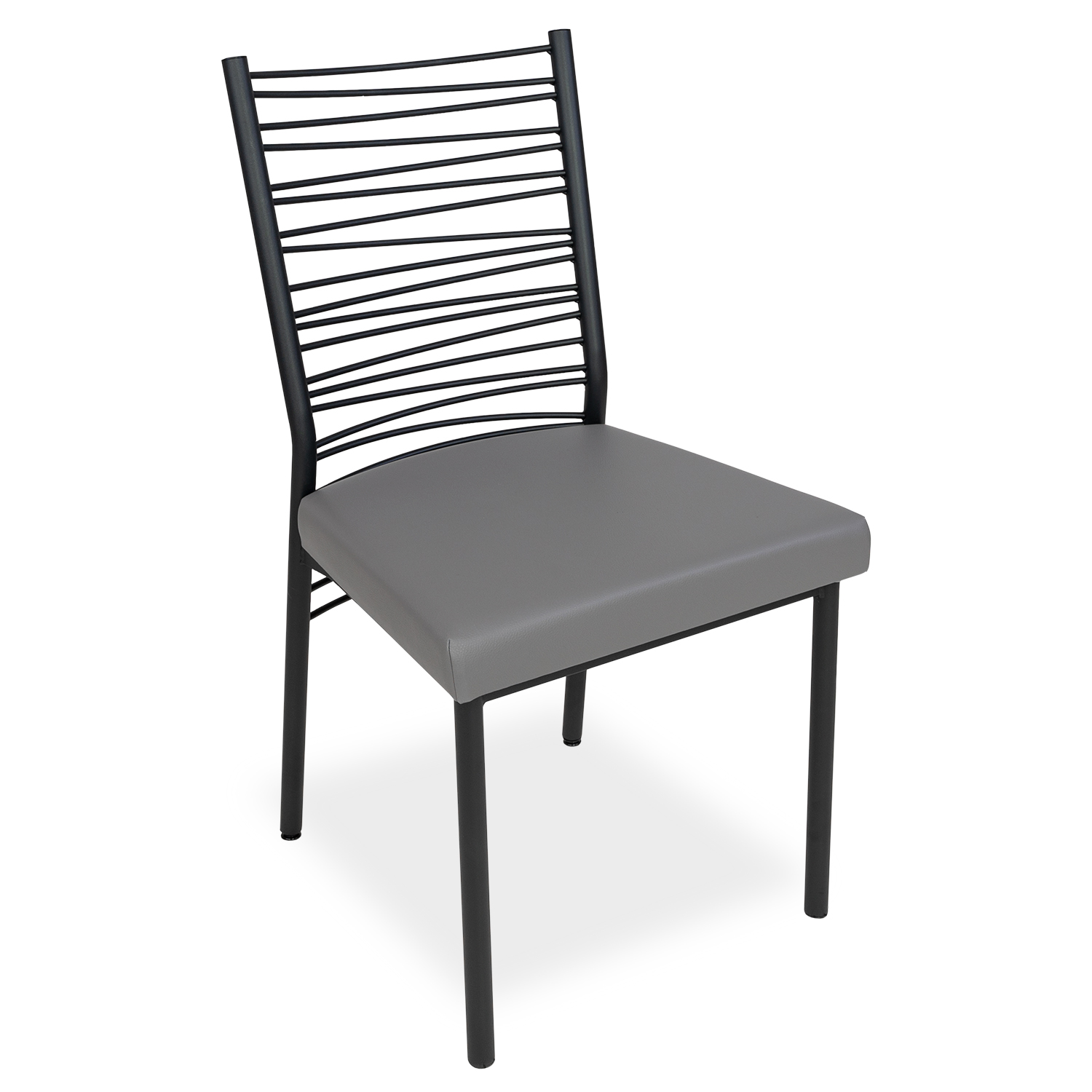 Instantly eye-catching, the Crescent Dining Chair features a backrest of slim, curved horizontal bars that extend down past the seat in an organic, pleasingly asymmetrical pattern. Crescent's black metal frame has a matte finish with a lightly grained texture, while its seat cushion is upholstered in a complementary pewter grey leatherette. The baked powder paint that coats the frame is long-lasting and eco-friendly, while the leatherette is tested to withstand over 100,000 double rubs, making the Crescent suitable for commercial use or many years in your home of cozy breakfasts, lively lunches, and satisfying dinners.