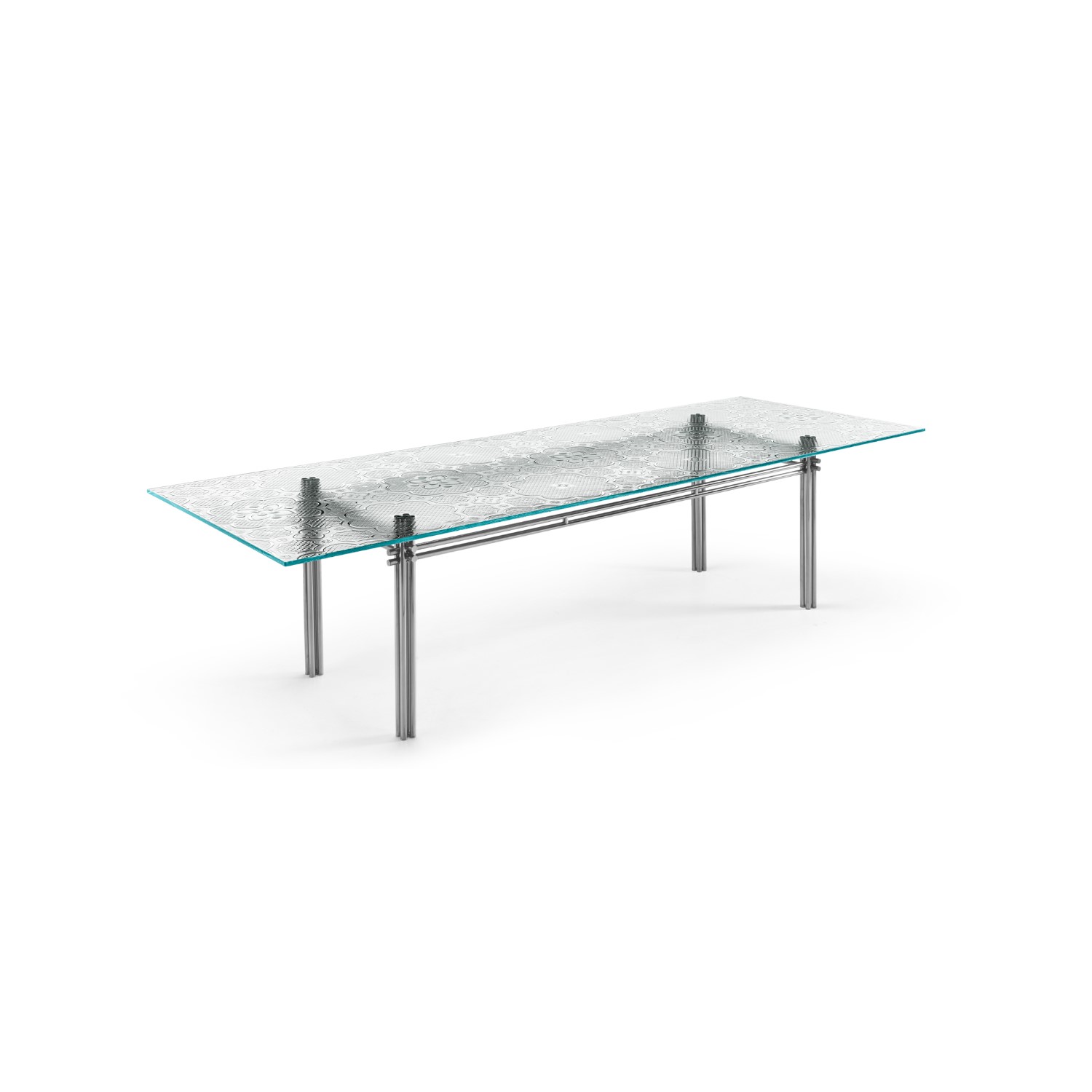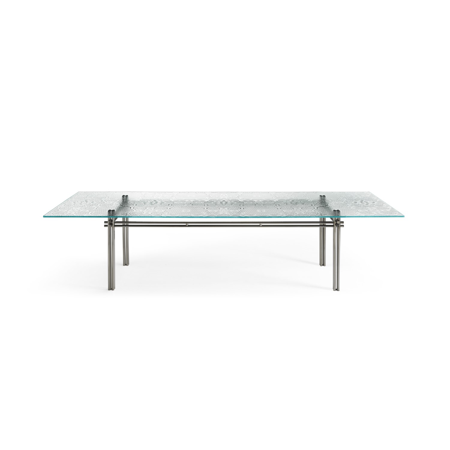[0] => Designed by Marcel Wanders Studio, the Cristaline Table is a magnificent work of functional art sure to be the highlight of your dining space. A stellar model of contemporary Italian design, this table boasts a clear rectangular top made of fused and tempered extralight glass with a floral medallion pattern etched underneath. Its metal base features a black glossy nickel finish and slim legs whose clean lines form a contrast with the more ornate tabletop. A true original, the Cristaline Table will inspire awe and appreciation at any dining occasion.