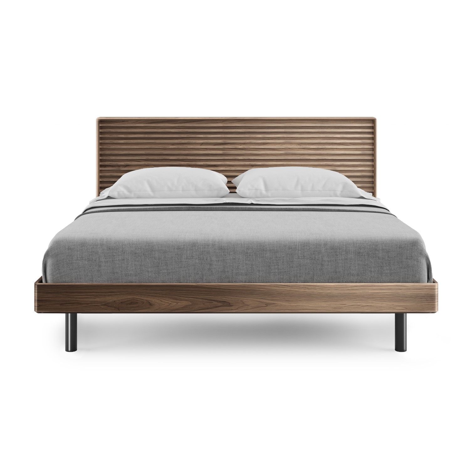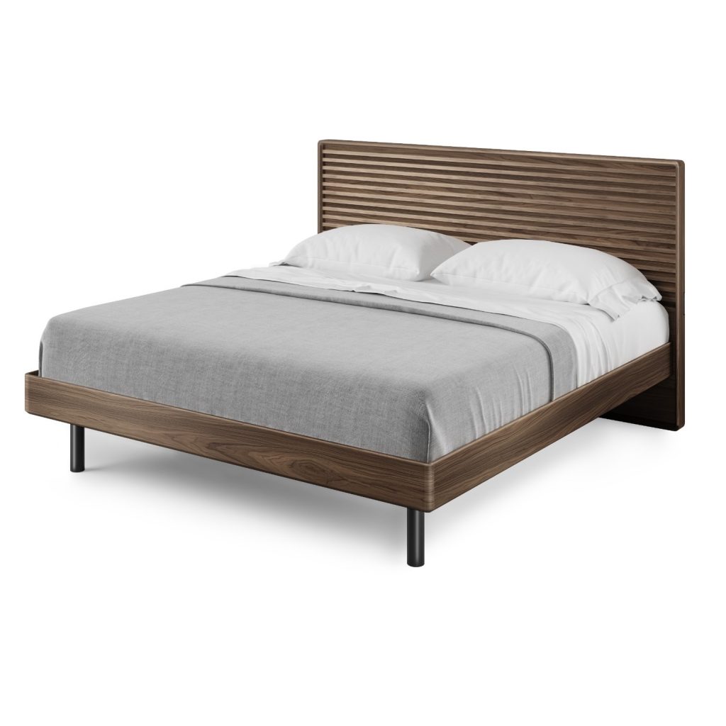 Designed by Matthew Weatherly for BDI, the Cross-Linq King Bed combines a classic walnut veneer with cutting-edge features made to fit your modern lifestyle. Cross-Linq's headboard has a bold slatted front that includes an ultra-convenient charging station on either side. With discreet USB-A and USB-C ports, both you and your partner can charge devices and stay connected from the comfort of your bed.
