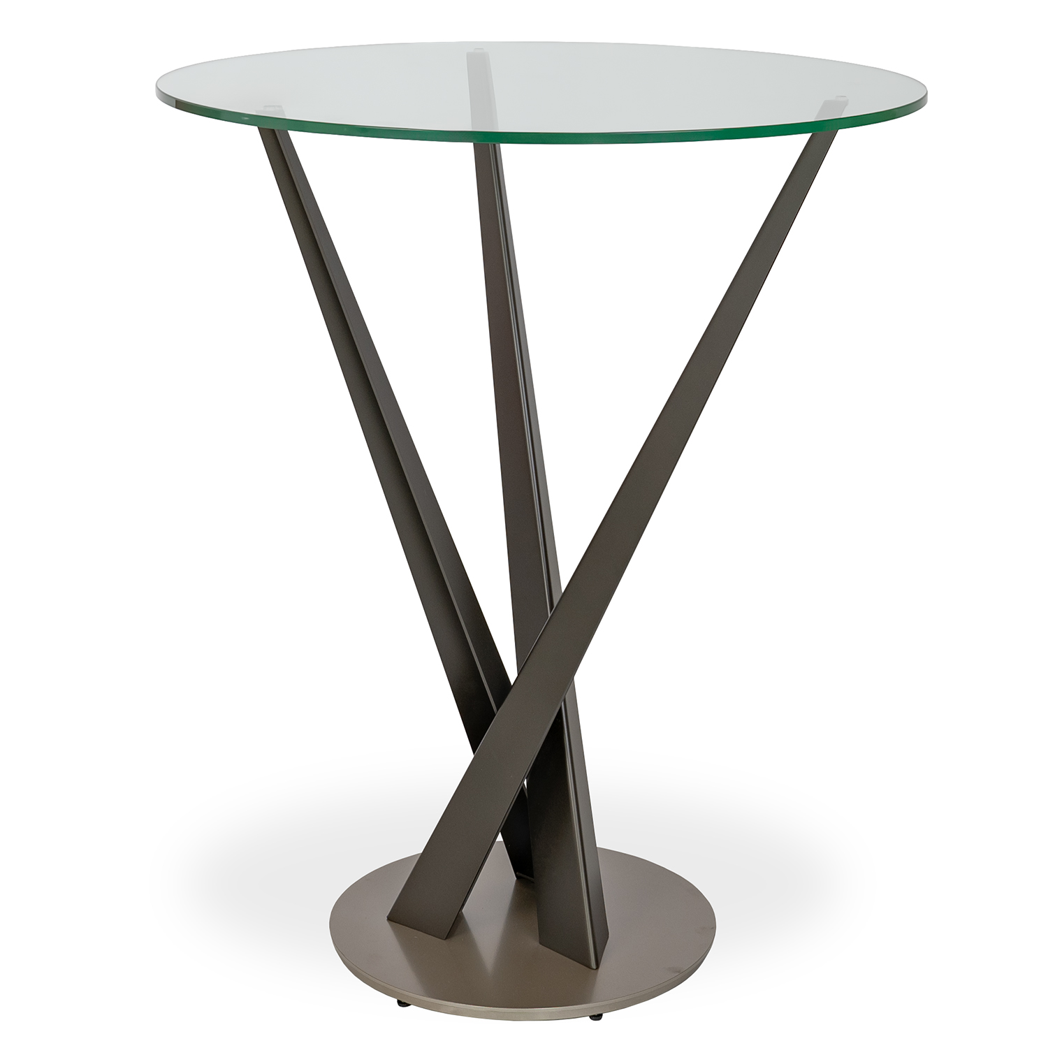 [0] => The Crystal Pub Table features a sculptural base with steel legs in lava grey and a round glass tabletop for an artistic, one-of-a-kind look. The staggered legs extend upward from the circular topaz base, creating a feeling of dynamic movement. Crystal's clean, sophisticated style will look attractive in any contemporary design environment.
