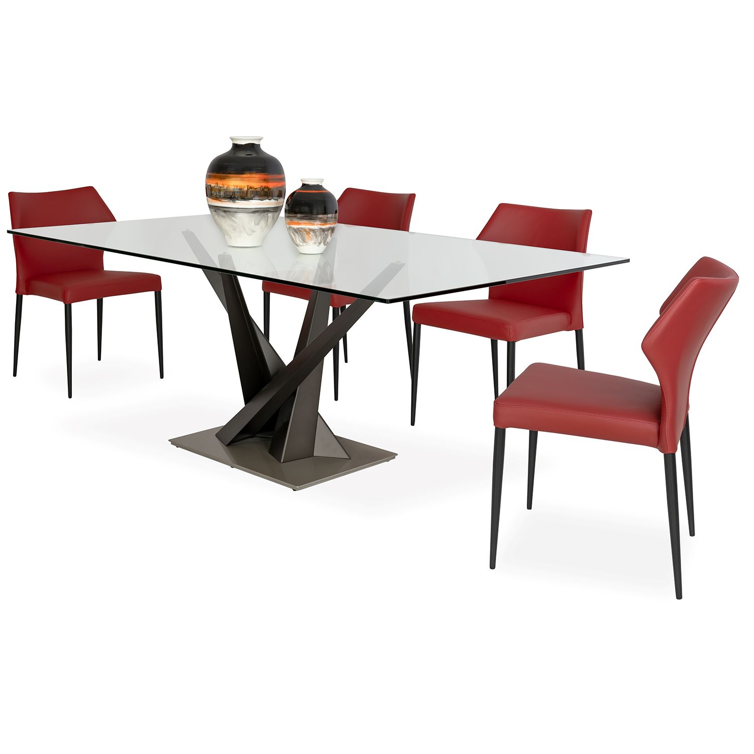 The Crystal Rectangular Dining Table, by Elite Modern, is a bold statement piece with a glass tabletop and powder-coated topaz metal base. The spacious rectangular top has enough room for family meals or entertaining, while nature meets design in the sculptural lava-colored legs inspired by the intersecting forms of natural crystals.