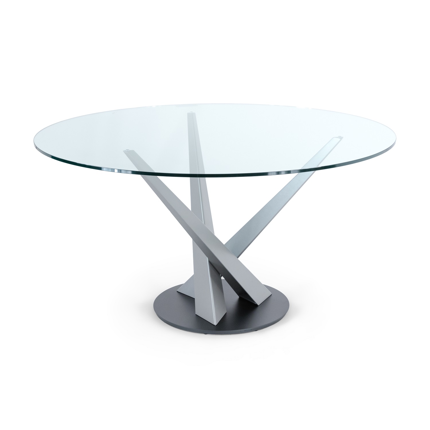 [0] => The Crystal Round Dining Table, designed by Elite Modern, features a circular glass tabletop and powder-coated carbon metal base. Sleek and sculptural, the three mist grey-colored legs of the base are inspired by the natural growth patterns of crystals. This table is a simple yet beautiful statement piece for any dining occasion.
