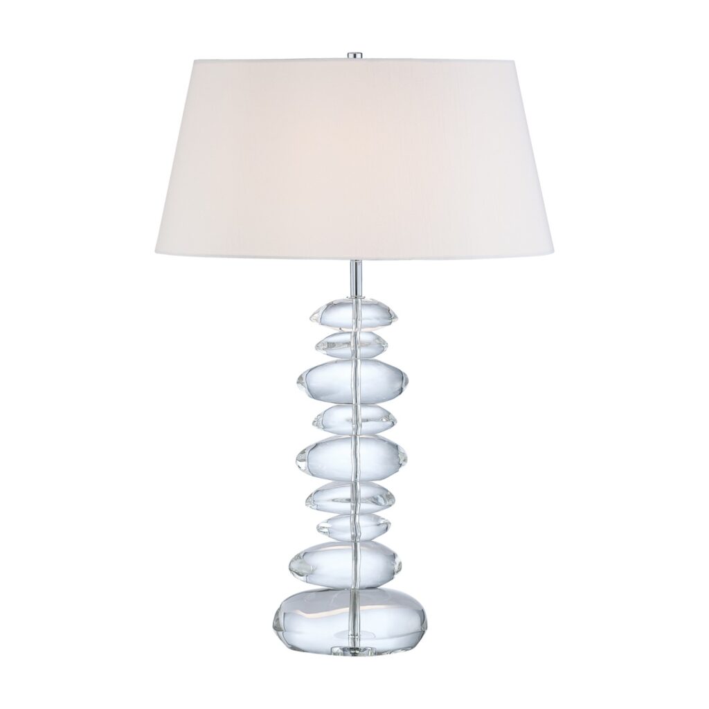 [0] => The Crystal Table Lamp features a white linen shade, a chrome stem, and a clear, sculptural base reminiscent of a stack of pebbles. With its artistic design and neutral color palette, Crystal can integrate well into any contemporary space. The Crystal Table Lamp takes one A19 frosted LED bulb, included with purchase.