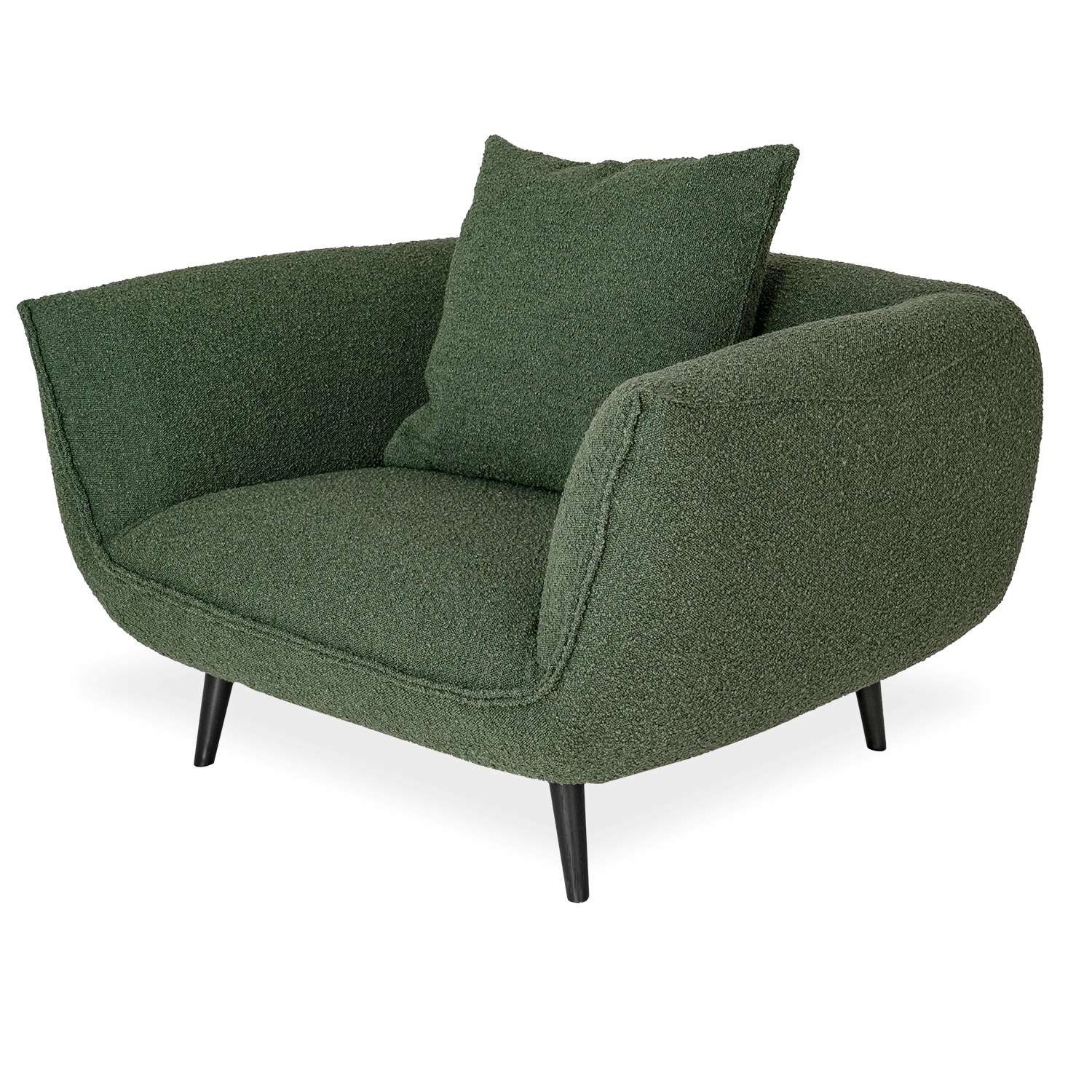 The Cullin Chair features a rich shade of green and a plush, inviting silhouette that welcomes you to sit back and relax. The Belmont fabric upholstery in deep olive green has a three-dimensional, slubbed texture and is woven from a cozy blend of polyester, recycled polyester, and acrylic. Cullin's wide seat with no-sag springs gives you lasting support, while the backrest curves seamlessly into gently angled armrests for a striking look. Inverted seams, black wood legs, and an included pillow add the finishing touches to a chair that will infuse your living room with depth and style.