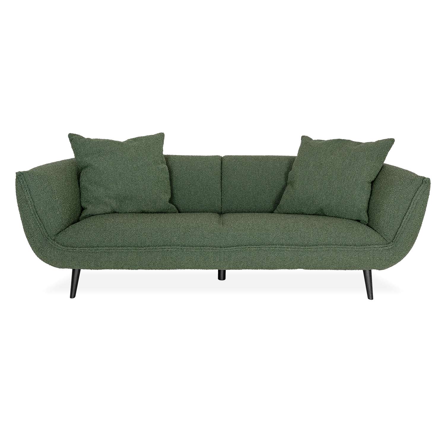 [0] => The Cullin Sofa features a rich shade of green and a plush, inviting silhouette that welcomes you to sit back and relax. The Belmont fabric upholstery in deep olive green has a three-dimensional, slubbed texture and is woven from a cozy blend of polyester, recycled polyester, and acrylic. Cullin's two wide seats with no-sag springs give you lasting support, while the backrest curves seamlessly into gently angled armrests for a striking look. Inverted seams, black wood legs, and two included pillows add the finishing touches to a sofa that will infuse your living room with depth and style.