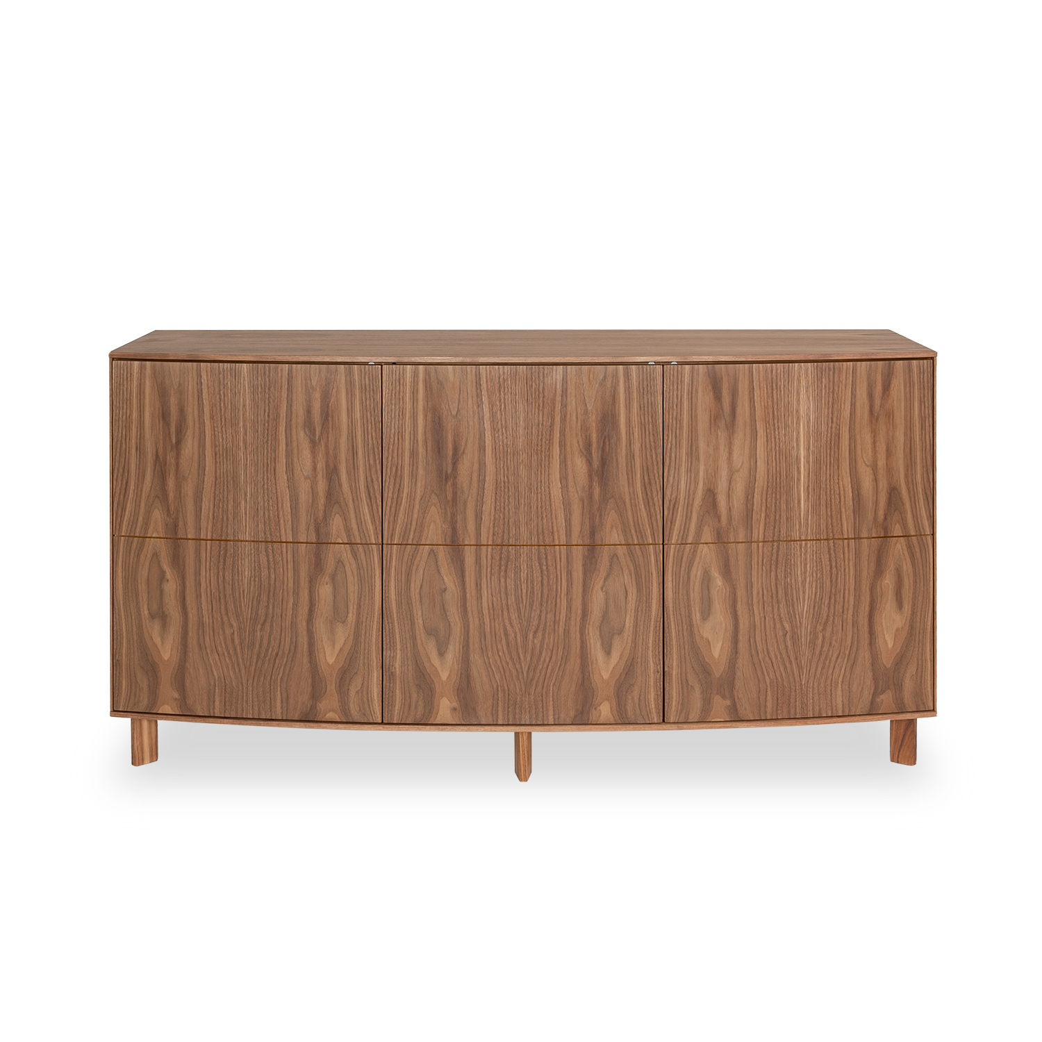 [0] => The Skovby Curve Three-Door Sideboard, crafted from walnut wood and lacquered in natural oil, offers spacious storage with a clean and classic design. It features three molded veneered doors with a carved line running across them for an accentuated look, plus an inner drawer to store cutlery or assorted odds and ends. The front of this sideboard has a gentle convex curve for a pleasing impression.