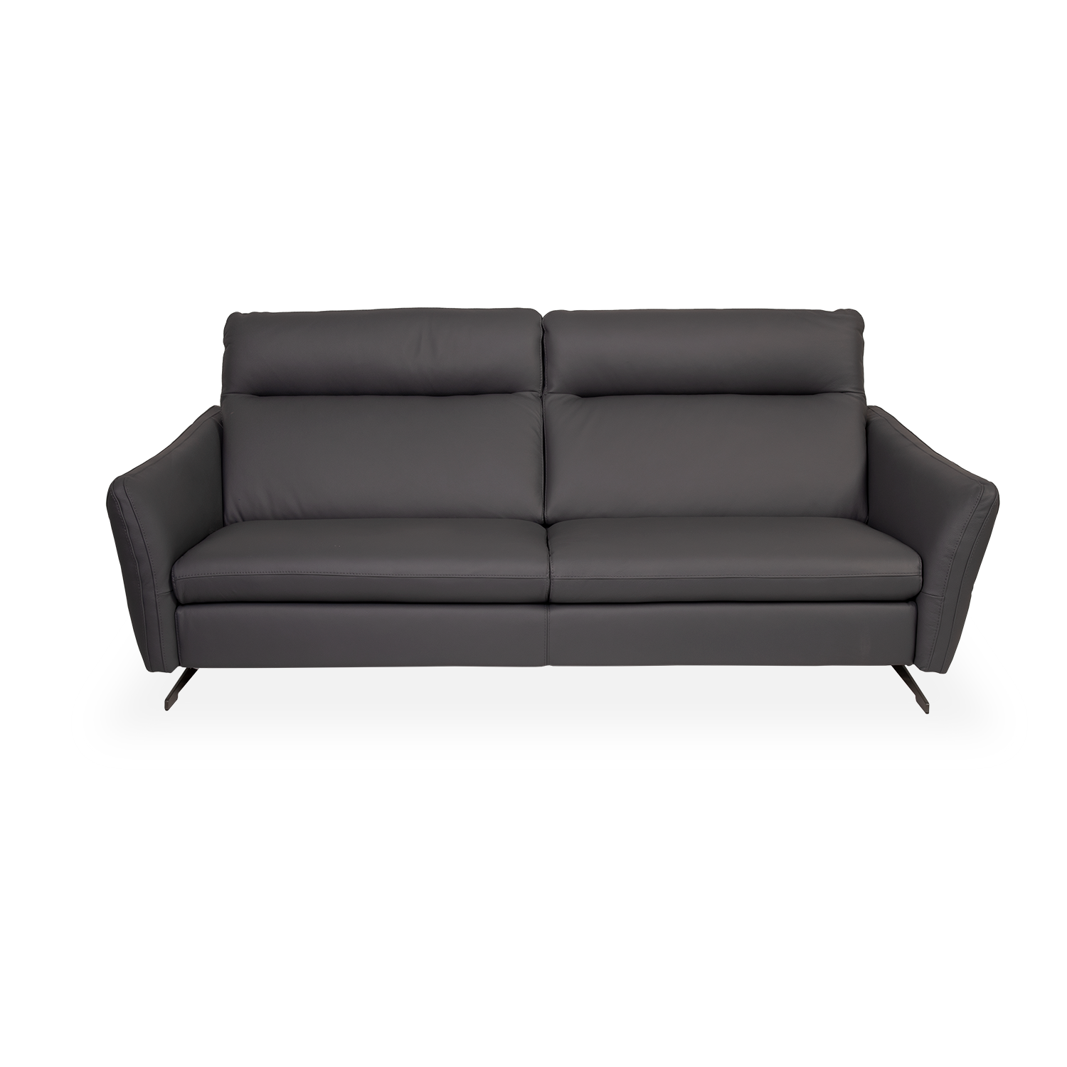 The Dana Sofa features grey leather and dark grey metal legs for a look that is sophisticated and inviting. The curved armrests add flair and contrast against the straight lines of the cushions and stitching, and the slim legs are sleek and stylish. Dana's neutral color and clean design will make it a well-loved piece in any living space.