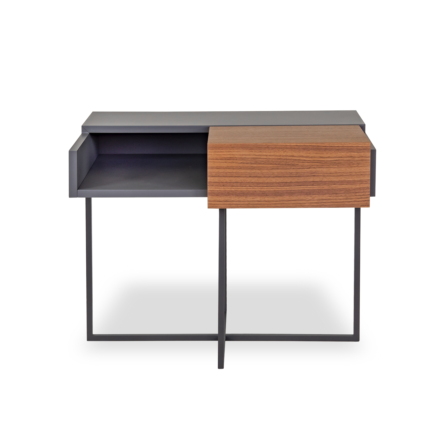 [0] => The Dante Night Table, made in Italy and available in graphite lacquered wood, is the ideal minimalist nightstand with hidden storage space. A natural walnut sliding door moves to either side, allowing you to access or conceal the storage compartment within. Thin linear legs form an attractive cage-like base, and the muted tones of this piece enable it to fit into any design environment.