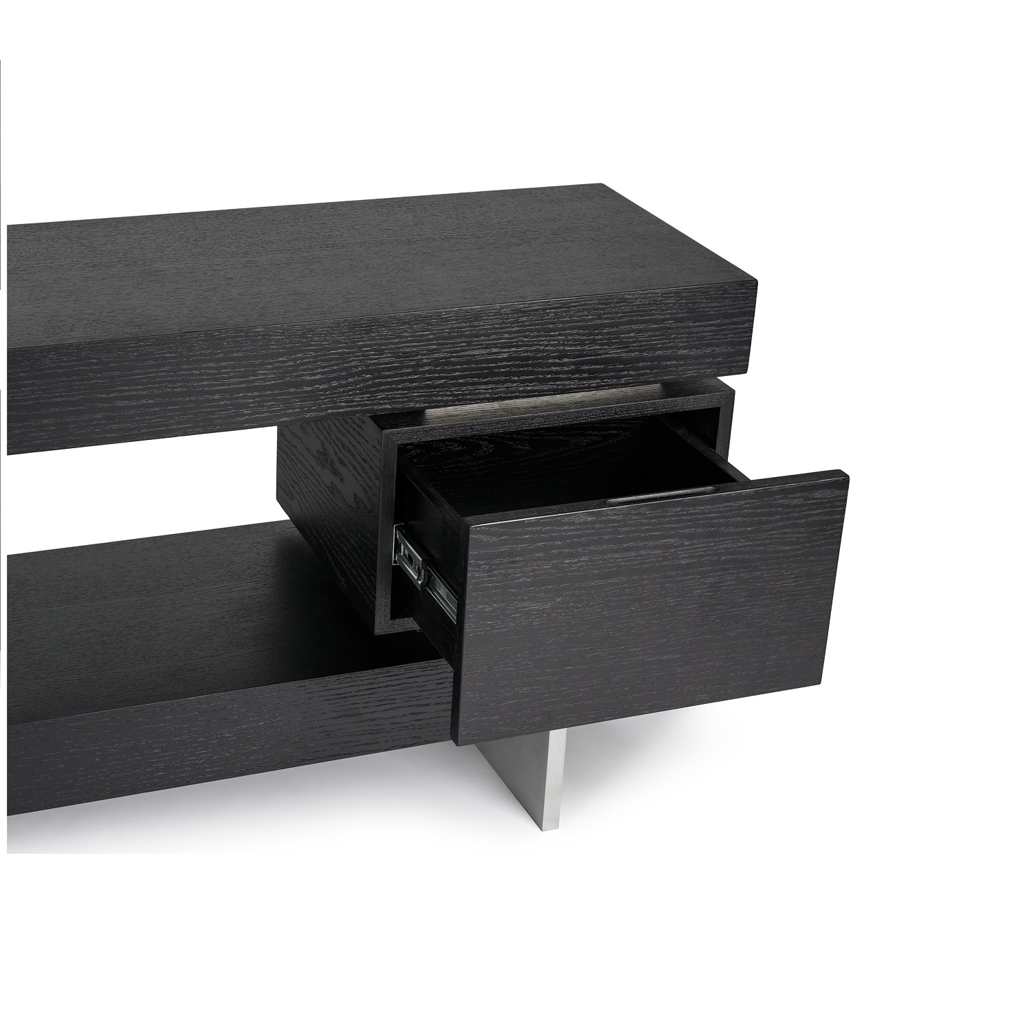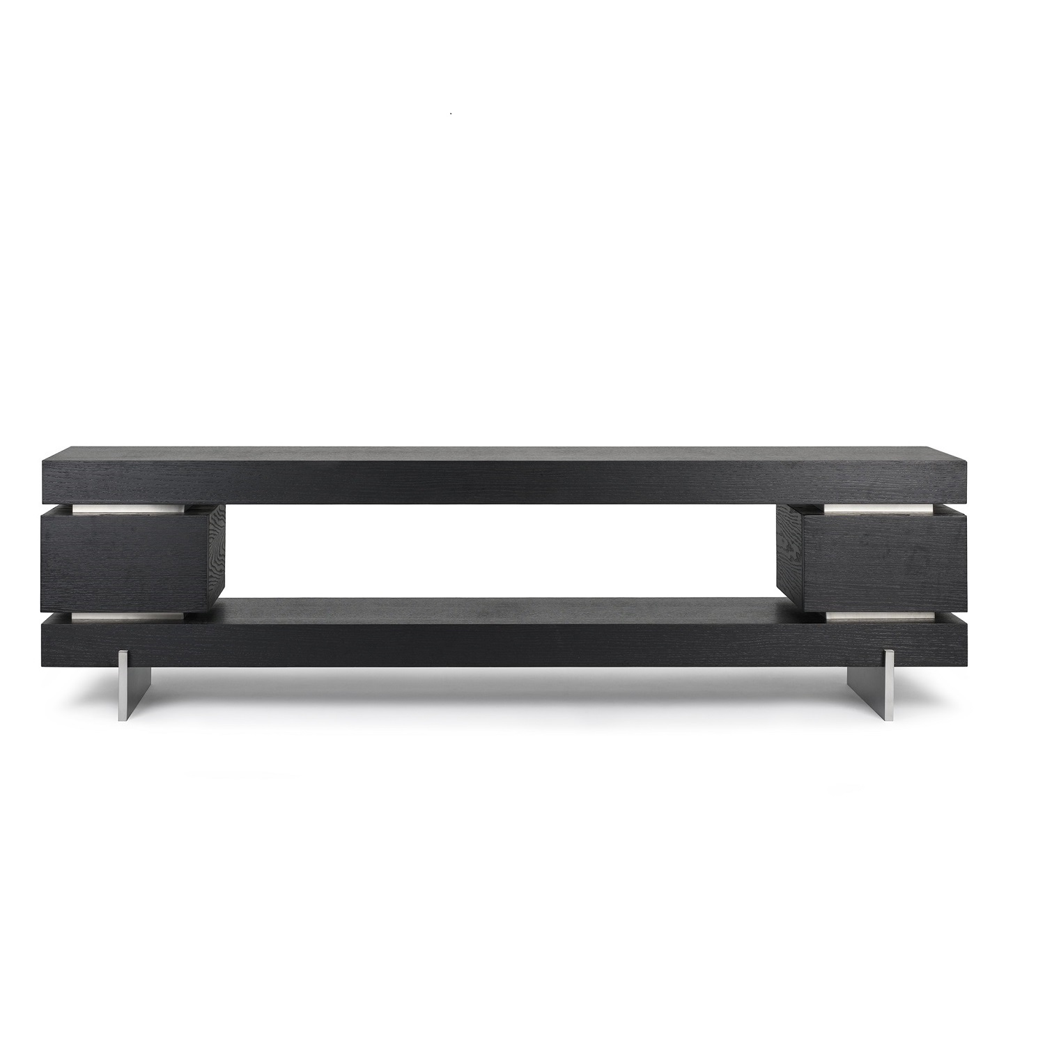 [0] => The Darius TV Console, available with a wenge finish, offers an elegant display and storage solution for TV and entertainment equipment. Darius' three-tiered design and open storage shelf give it a bold modern look, while its brushed steel trim and legs elevate its aesthetic appeal. Two hidden drawers in the side units enhance the functionality of this contemporary console.