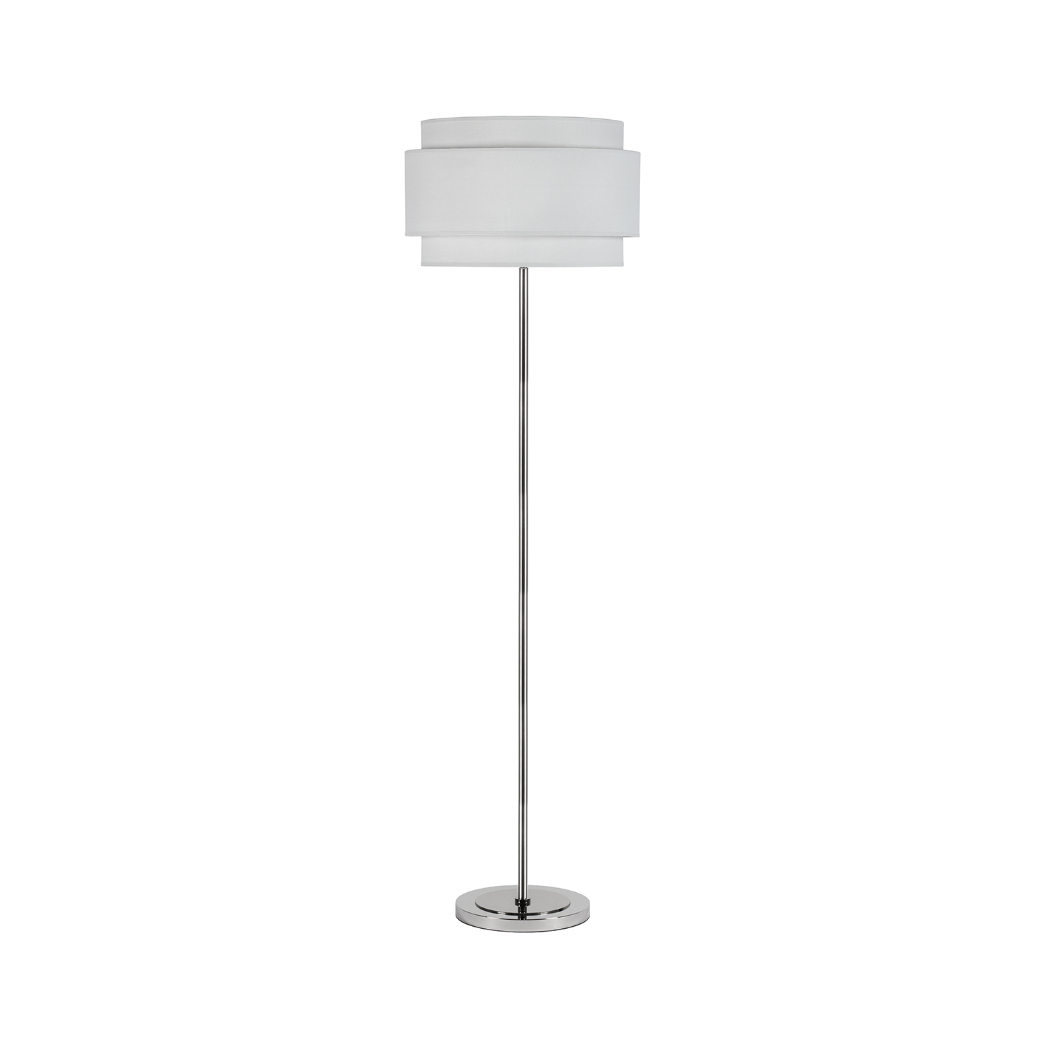 The Decker Floor Lamp features a nested pearl gray fabric shade that creates a warm and inviting atmosphere. Available with a polished nickel finish, this lamp has a full range dimmer and a switch on the socket. The 144'' cord is silver and has a 2 prong plug. Simple yet elegant, this lamp is perfect for any minimalist space. The Decker Floor Lamp requires one 150W max type A lightbulb, not included with purchase.