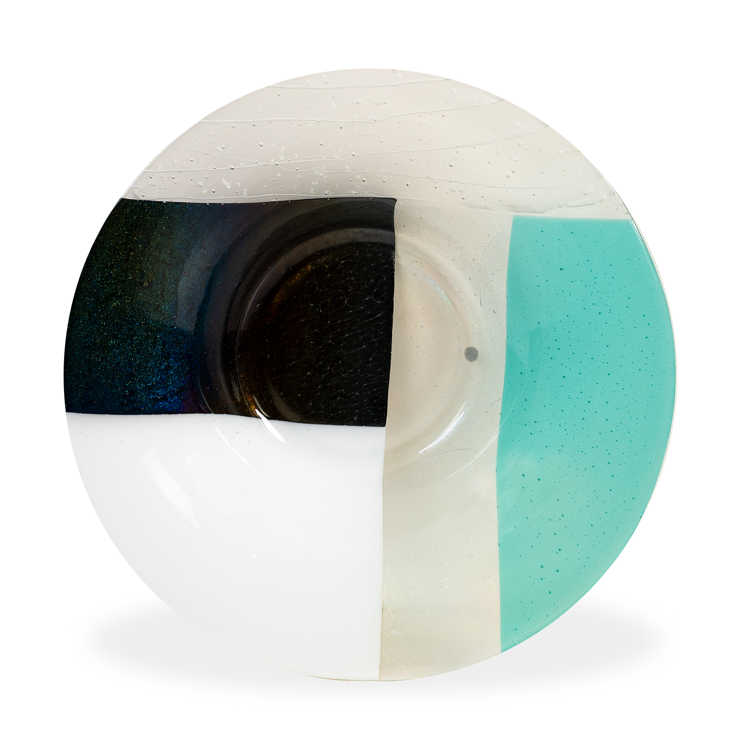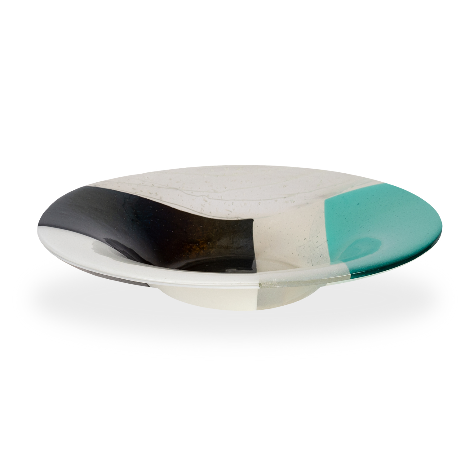 Designed by Arizona glass artisans Carole Perry and Don Carroll, the Colorblock Deep Bowl boasts a skillfully crafted variety of visual textures and hues. This bowl's colorblock pattern features an opaque white section, a transparent turquoise section, a frosted clear section accented with white lines and specks, and two sections -- one black and one clear -- ingrained with an iridescent rainbow shimmer. Display this bowl on its own, fill it with fruit or foliage, or give it as a gift for any lover of fine glasswork or modern accessories.