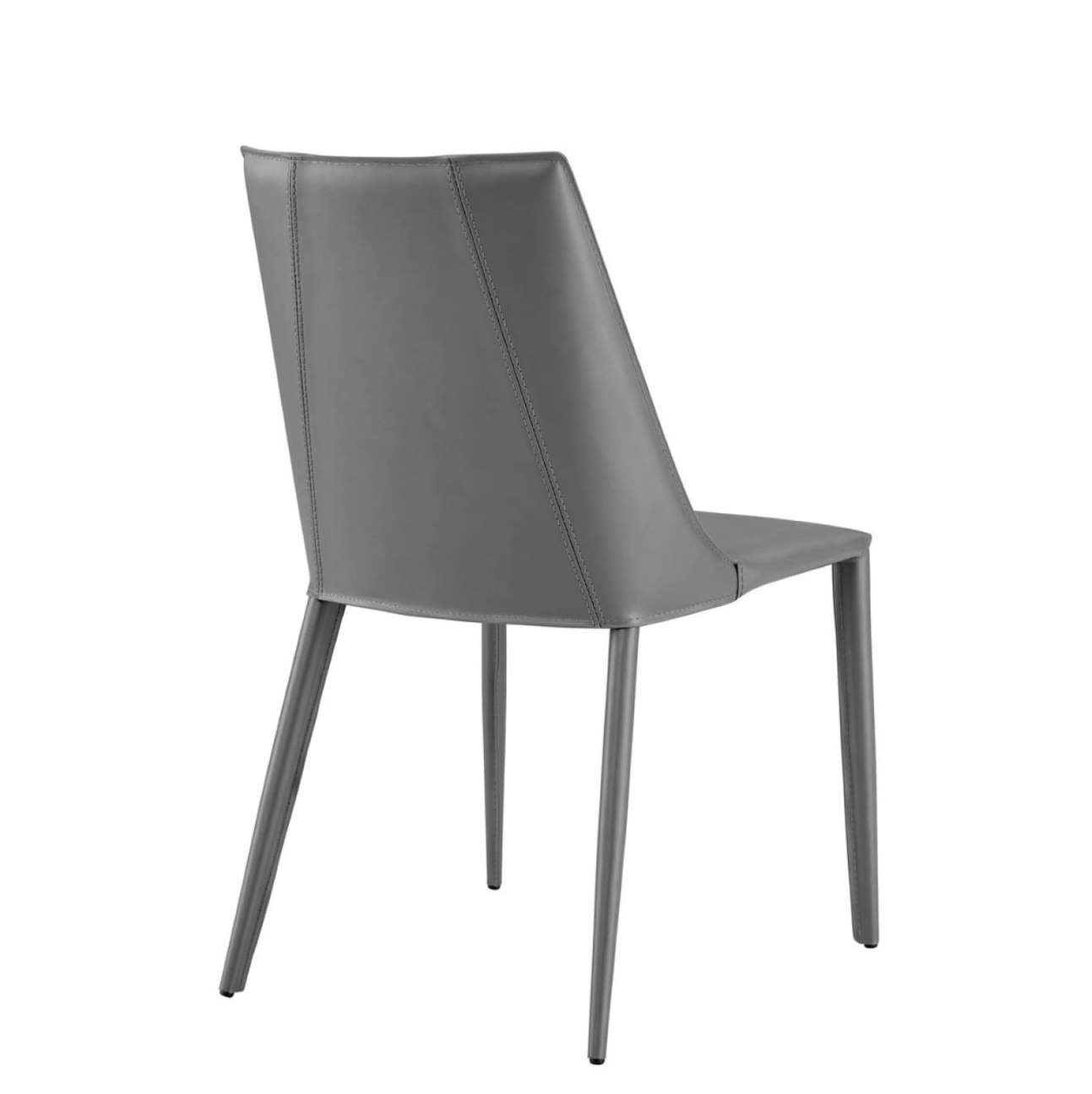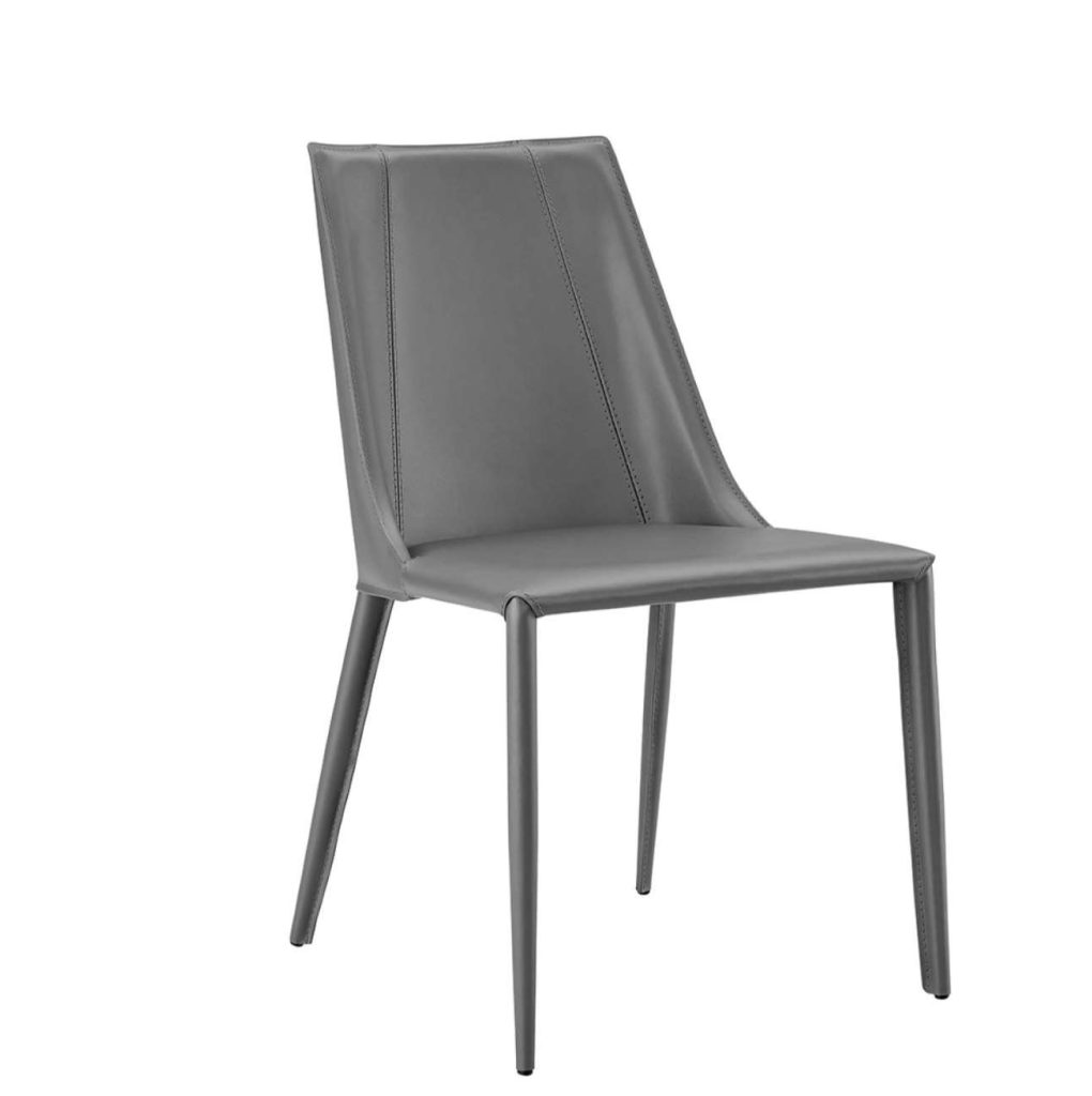 The Della Side Chair has a contemporary, streamlined look, with a sturdy powder-coated steel frame and durable bonded leather in grey. Diagonal stitching on the seat back adds dimension, and the fully-wrapped legs enhance Della's sleek style. With its neutral tones and elegant design, Della can complement a wide variety of dining environments.