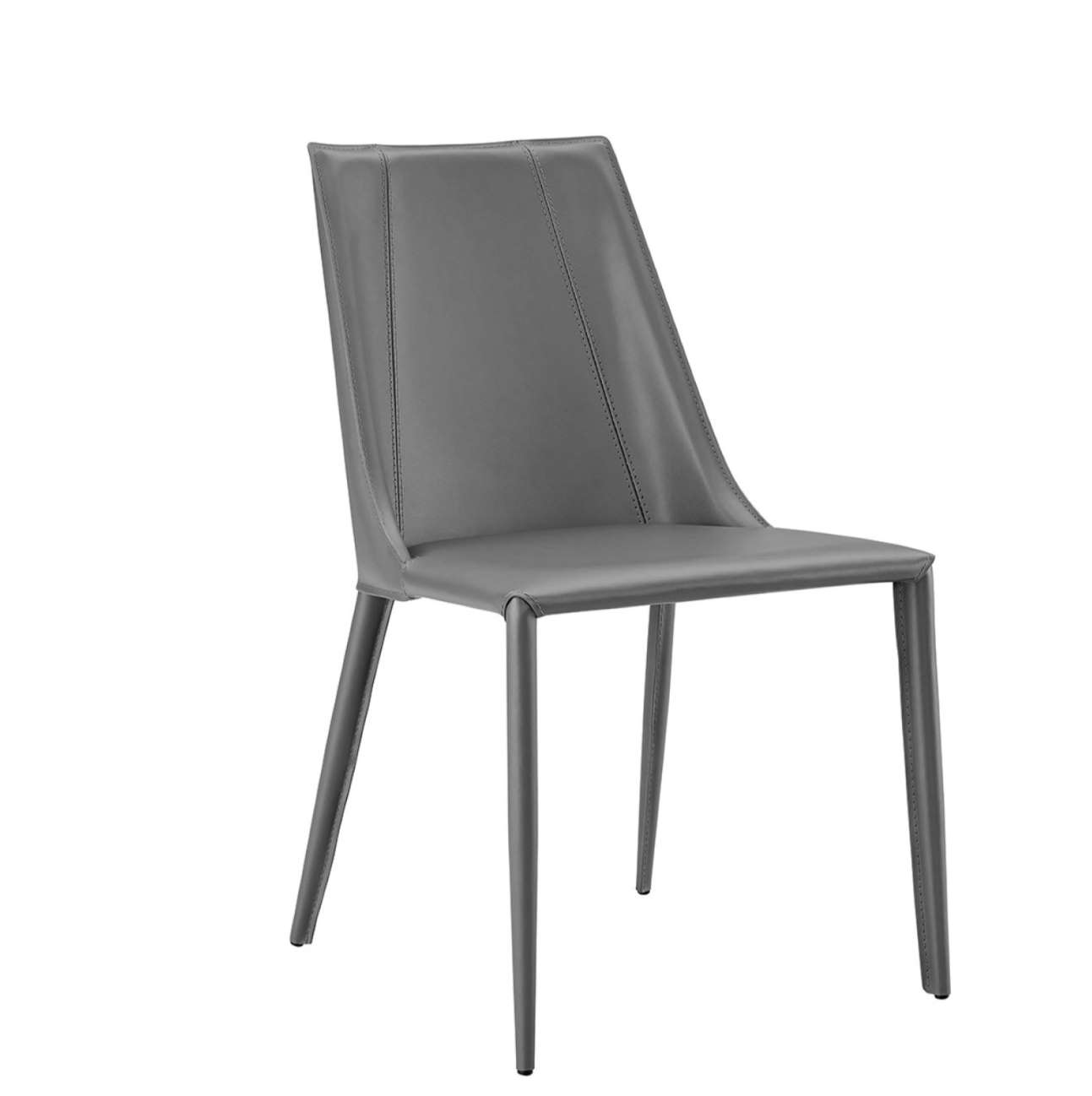 [0] => The Della Side Chair has a contemporary, streamlined look, with a sturdy powder-coated steel frame and durable bonded leather in grey. Diagonal stitching on the seat back adds dimension, and the fully-wrapped legs enhance Della's sleek style. With its neutral tones and elegant design, Della can complement a wide variety of dining environments.