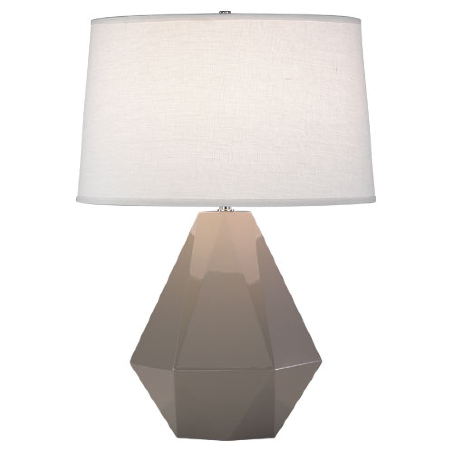 [0] => The Delta Table Lamp features an oyster linen shade and a taupe glazed ceramic base with polished nickel accents. This piece has a charismatic, geometric design that is thoroughly modern and ideal for adding strong, bold lines to any enviornment. This lamp has a 3-way switch and takes one 150W bulb (max), type A.