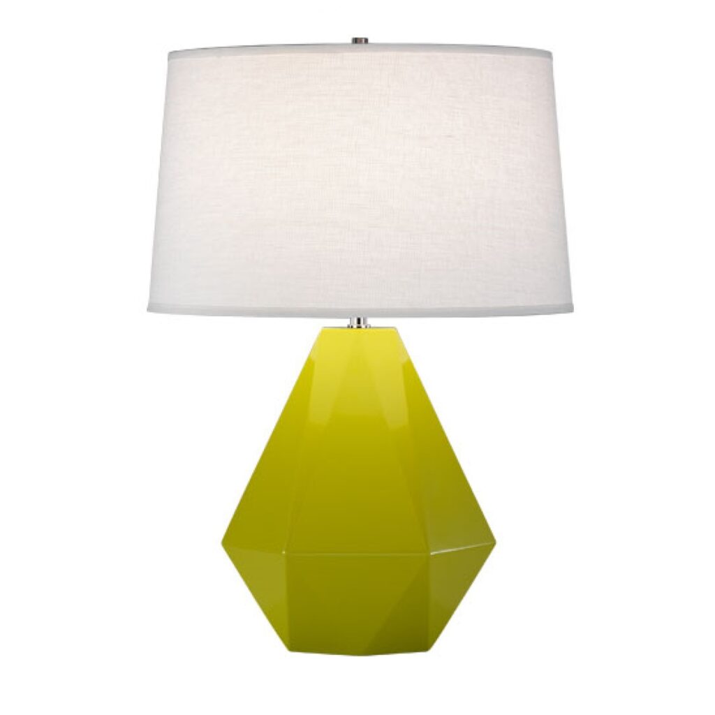 The Delta Table Lamp features an oyster linen shade and a olive glazed ceramic base with polished nickel accents. This piece has a charismatic, geometric design that is thoroughly modern and ideal for adding strong, bold lines to any enviornment. This lamp has a 3-way switch and takes one 150W bulb (max), type A.