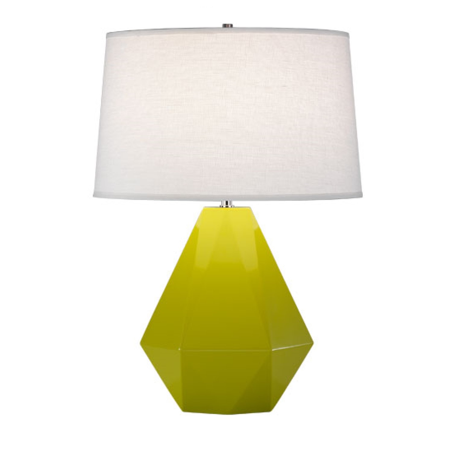 [0] => The Delta Table Lamp features an oyster linen shade and a olive glazed ceramic base with polished nickel accents. This piece has a charismatic, geometric design that is thoroughly modern and ideal for adding strong, bold lines to any enviornment. This lamp has a 3-way switch and takes one 150W bulb (max), type A.
