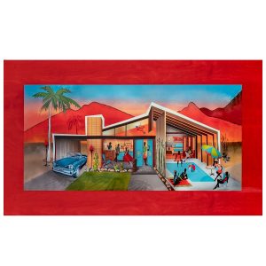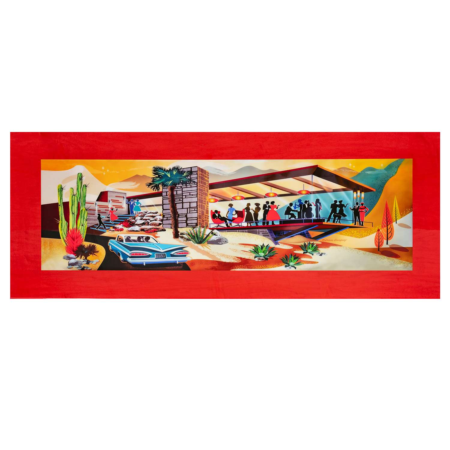 [0] => The Desert House Party Wall Art by Diane Dempsey is guaranteed to add personality and excitement to any space with its bright colors, fun mood, and retro 50's aesthetic. Available with a glossy surface, this artwork depicts silhouetted figures enjoying a party with live music at a modern house in the desert. Dempsey's skilled hand imbues the canvas with fine details and nostalgic touches, from the vintage car in the driveway to the egg chairs in the living room. The rich red hues of clothing, furniture, and plants in the scene are echoed in the red border that creates a bold frame around the image. With its large size that allows you to get lost inside the scene, Desert House Party transports you to a lively and carefree world.