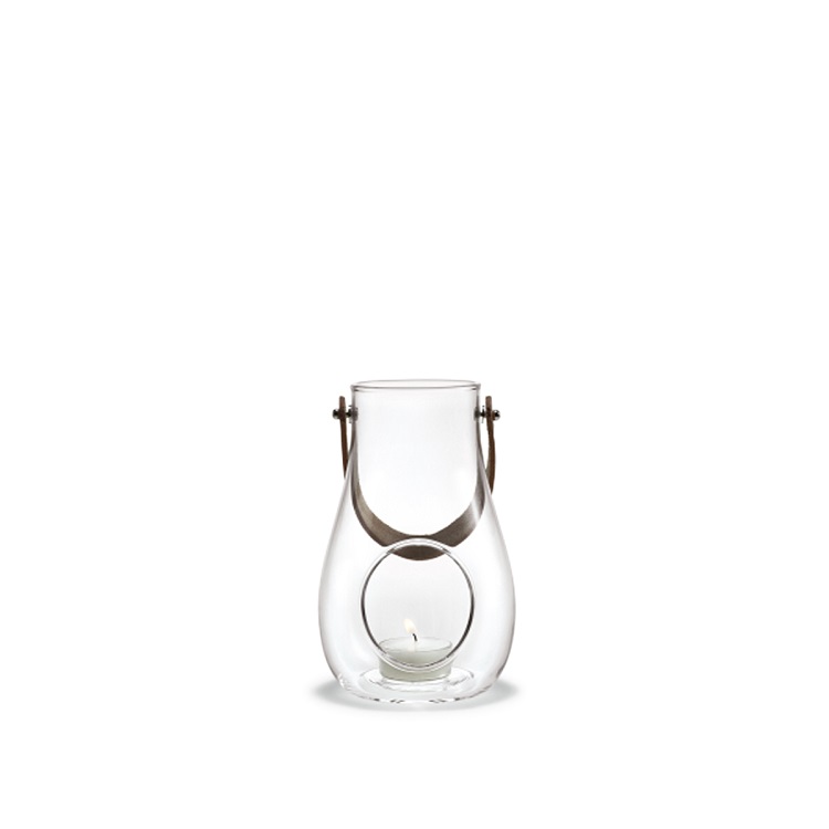 [0] => The Design with Light lantern casts warm, dynamic light on its surroundings and can be placed truly anywhere - on your table as part of your holiday setting, on the ground on a warm summer evening, or on a nearby table to bring warmth and coziness to a dark winter night. With its glass body and full-grain leather strap, the lantern has a clean, Scandinavian look and can be used all-year around. The lantern can be placed indoors or outdoors, though it should be stored indoors to protect the leather handle. The lantern's round opening is hand-shaped by Holmegaard of Denmark's expert craftsmen.
