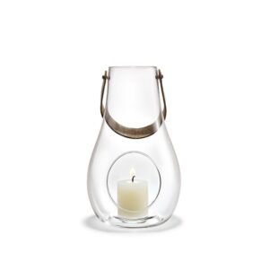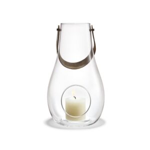 [0] => The Design with Light lantern casts warm, dynamic light on its surroundings and can be placed truly anywhere - on your table as part of your holiday setting, on the ground on a warm summer evening, or on a nearby table to bring warmth and coziness to a dark winter night. With its glass body and full-grain leather strap, the lantern has a clean, Scandinavian look and can be used all-year around. The lantern can be placed indoors or outdoors, though it should be stored indoors to protect the leather handle. The lantern's round opening is hand-shaped by Holmegaard of Denmark's expert craftsmen.
