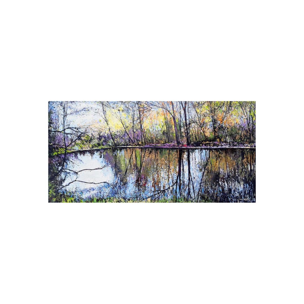 [0] => Diagram of Happiness by Eduard Gurevich is a landscape painting featuring expert brushwork and bright, jewel-toned colors. Thin, dark brushstrokes combine with luminous shades of blue, green, yellow, and purple to depict a body of water reflecting the trees and sky that surround it. Available with a glossy finish, Diagram of Happiness will infuse any home or office with a serene, restorative atmosphere.