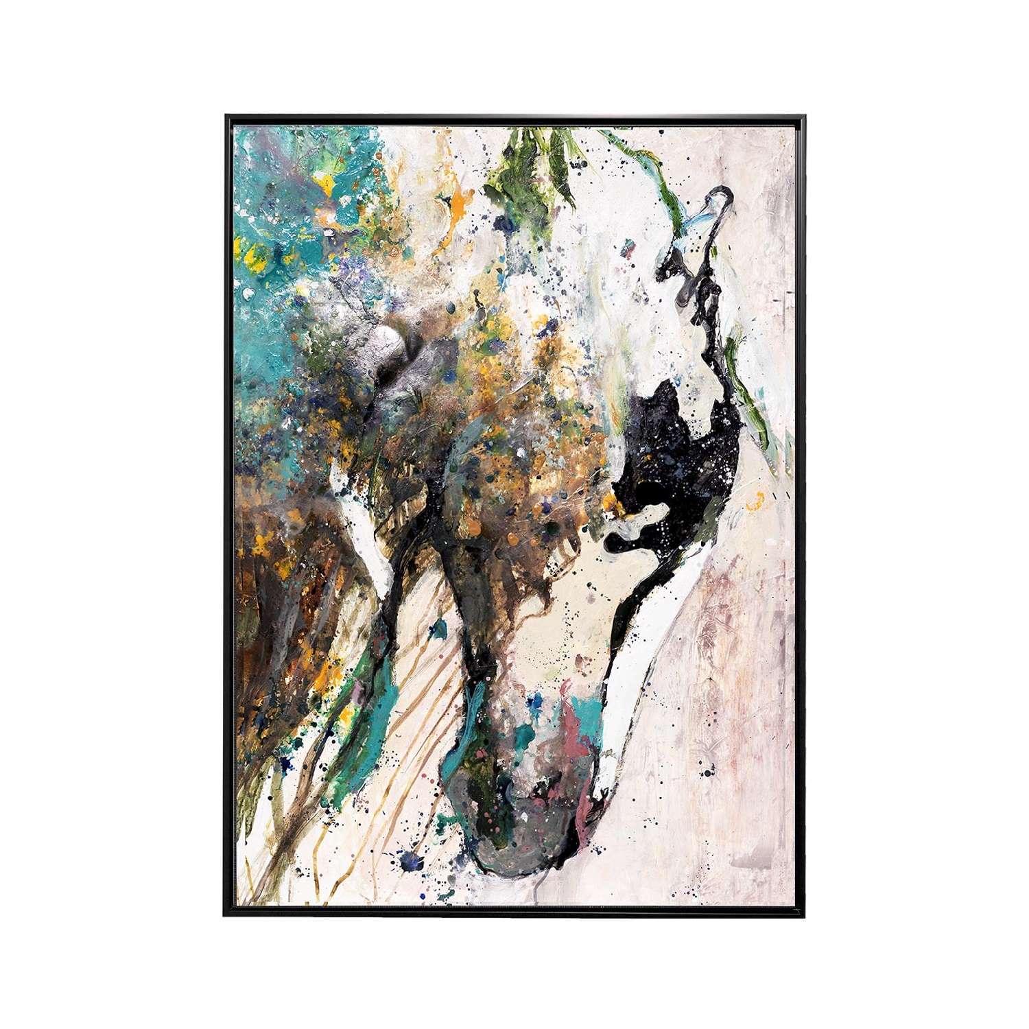 [0] => The Dianara Wall Art, by the artist Pyne, is an expressive, semi-abstract depiction of a horse's head. Bright and earthy tones of brown, turquoise, orange, pink, and green blend over the canvas in dynamic splatters, drips, and layers. With a generous canvas size that creates a larger-than-life effect, Dianara is the perfect home accent for lovers of horses, nature, and Southwestern style.