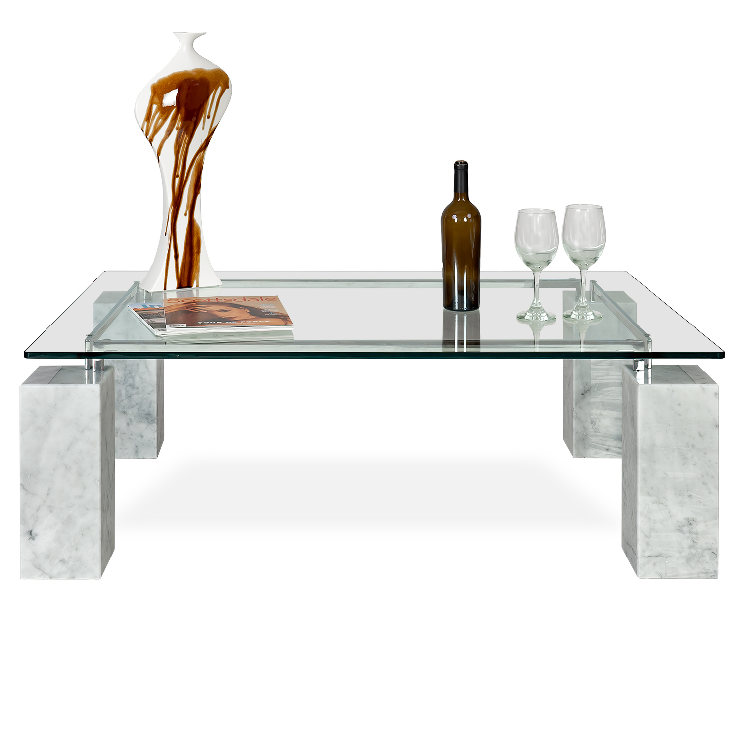 [0] => dielle coffee table 120x80cm rectangle with white carrara marble legs, chrome supports and clear glass top. 47.25" x 31.5" x 15.75"h.