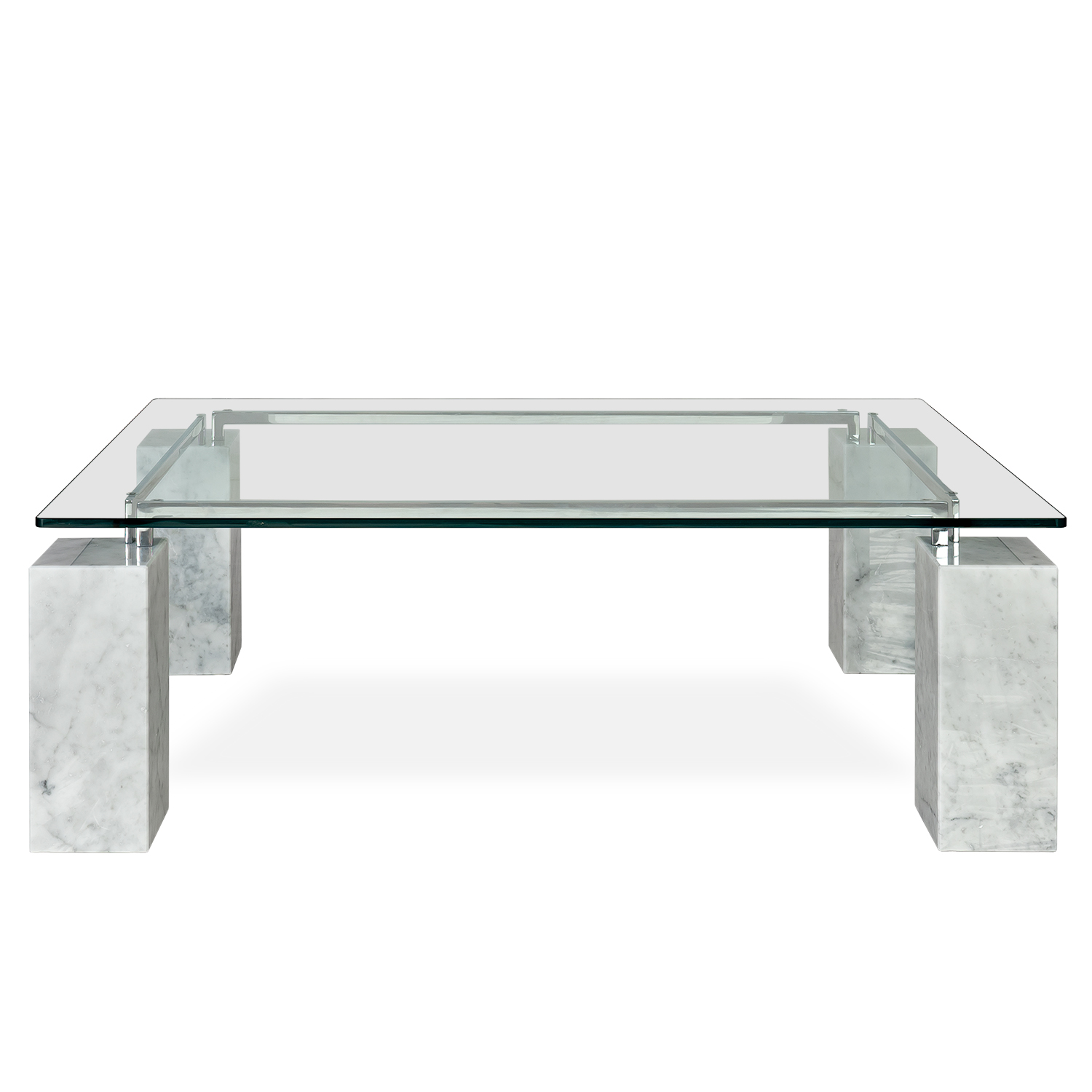Designed by Piero De Longhi, Dielle is a classic Italian coffee table dating back to 1984. Dielle's clear rectangular glass top allows you to fully admire its four columnar legs made of white marble with grey veining. A metal frame with a chrome finish anchors the glass to the marble and lends a floating effect to the tabletop. For an iconic coffee table that melds sleek lines with luxurious materials, look no further than Dielle.