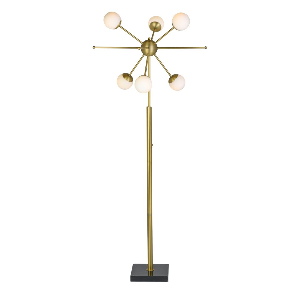 The Dielle LED floor lamp, with its brassy, sculptural base and glowing spherical lightbulbs, harkens back to the steampunk era, while maintaining an industrial chic vibe. The Dielle lamp adds style and pizazz to any space and makes a bold design statement. Dielle has an on/off rotary switch on the tube, a 60" black fabric covered cord, and requires six G9 3W LED bulbs, included with purchase.